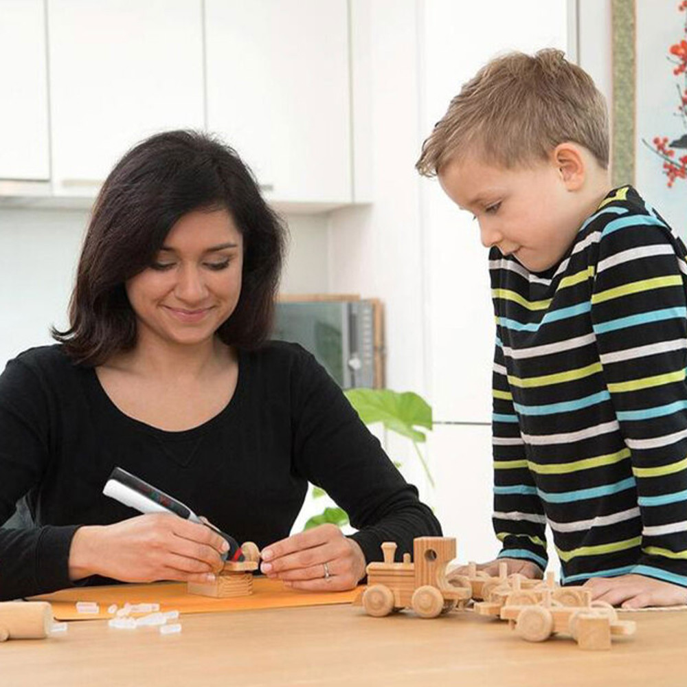 A készüléket szerszámos dobozban forgalmazzuk, és a készülékhez 18 cm hosszú transzparens, valamint 2,5 cm hosszú különböző színű színes ragasztórudakat is mellékeltünk