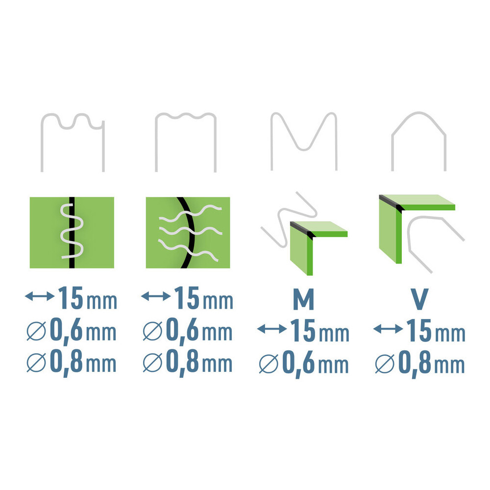 Rendelhető tartozékok a pótláshoz:Olvadórúd, 40 db, anyaga polipropilén (PP), hosszúság 200 mm (8862650)Olvadórúd, 40 db, anyaga polietilén (PE), hosszúság 200 mm (8862651)Olvadórúd, 40 db, anyaga akrilnitril-butadién-sztirol (ABS), hosszúság 200 mm (8862652)Hegesztő kapocs, 150 db, hullám, ∅ 0,6 mm, szártávolság 15 mm (8862640)Hegesztő kapocs, 150 db, hullám, ∅ 0,8 mm, szártávolság 15 mm (8862641)Hegesztő kapocs, 150 db, hullám, ∅ 0,6 mm, szártávolság 15 mm (8862642)Hegesztő kapocs, 150 db, hullám, ∅ 0,8 mm, szártávolság 15 mm (8862643)Hegesztő kapocs, 150 db, külső sarok „M” , ∅ 0,6 mm, szártávolság 15 mm (8862644)Hegesztő kapocs, 150 db, belső sarok „V”, ∅ 0,8 mm, szártávolság 15 mm (8862645)Réz forrasztócsúcs lágyforrasztáshoz (8891504A)