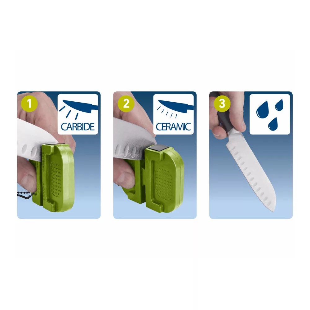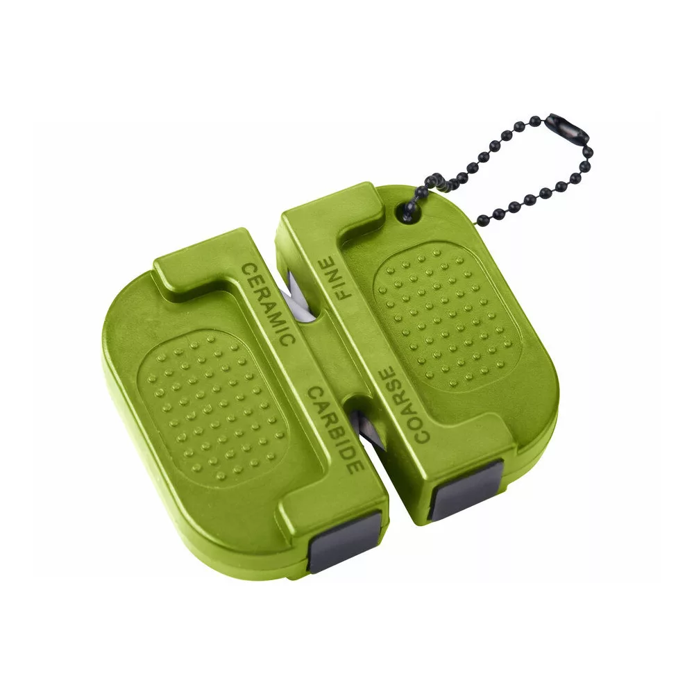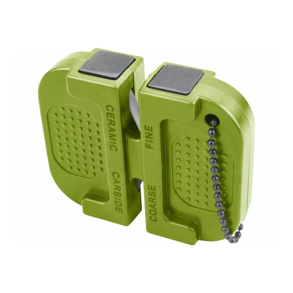 Keményfém (carbide) betét durva élezéshez és kerámia betét a finom élezéshez, mindenféle sík (nem fogazott) acél pengéhez