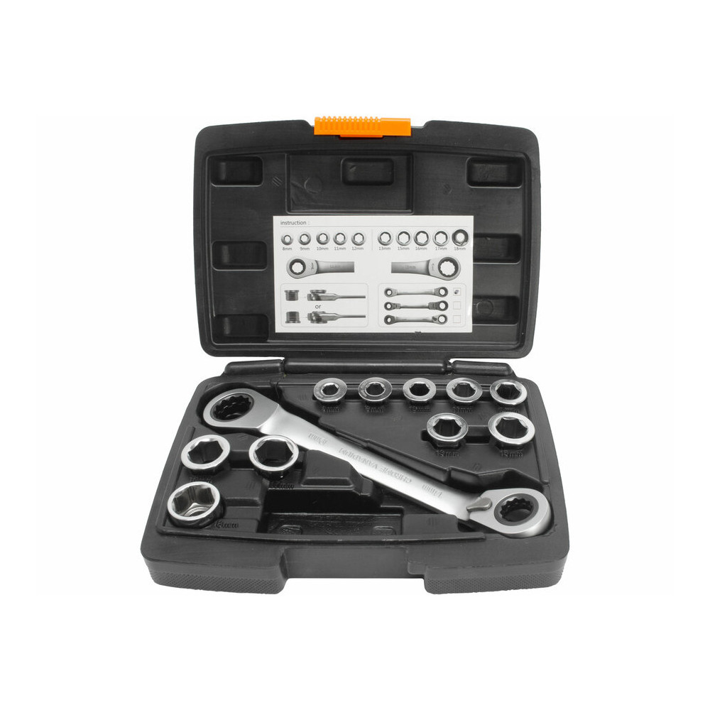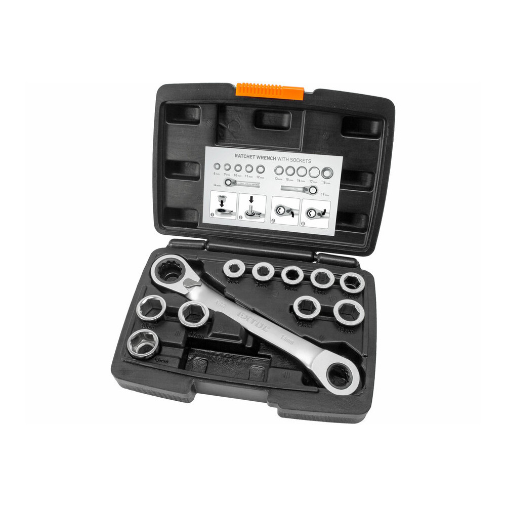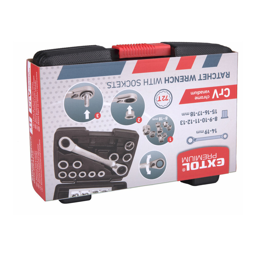 Extol Premium racsnis csillagkulcs készlet 11db; cserélhető betétekkel: 8-19mm CrV. 72 foggal, 2 irányú forgás