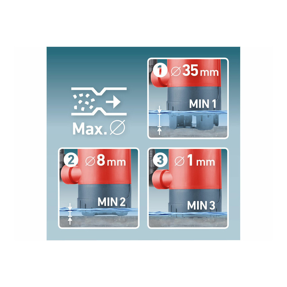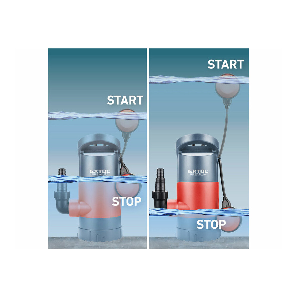 Az állítható talpú Extol Premium elektromos búvárszivattyú tiszta ill. szennyvíz szivattyúzására szolgál árkokból, halastavakból, patakokból, tűzoltó tartályokból stb.Állítható magasságú talprészének köszönhetően a szivattyú kiválóan alkalmas rendkívül alacsony szintig kiszivattyúzni az elárasztott terekből a vizet.Az állítható talp segítségével beállítható az átmenő részecskék mérete (1, 8 vagy 35 mm), és így szennyvíz szivattyúzására is lehetőség nyílik.A beállítható hosszúságú úszókábel lehetővé teszi annak meghatározását, hogy milyen szintmagasság esetén kapcsoljon be vagy ki a szivattyú.