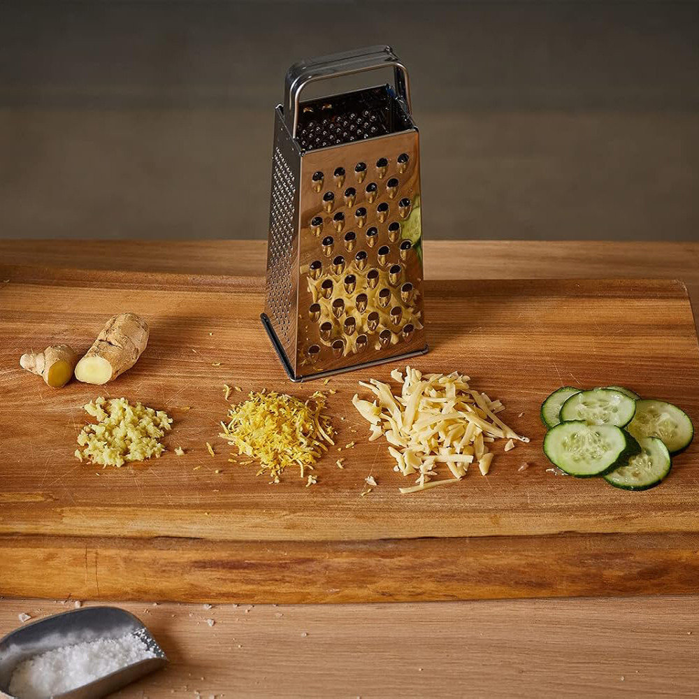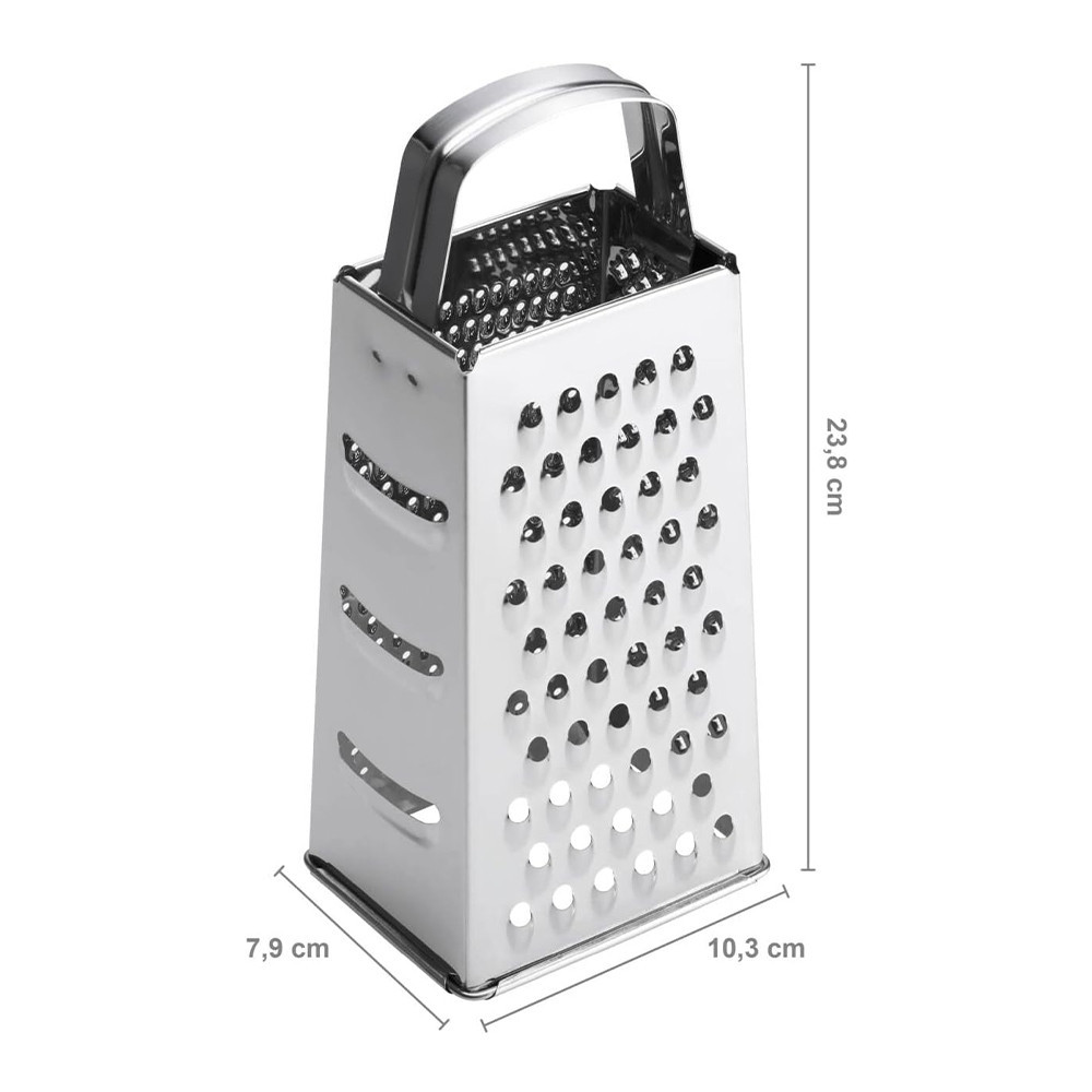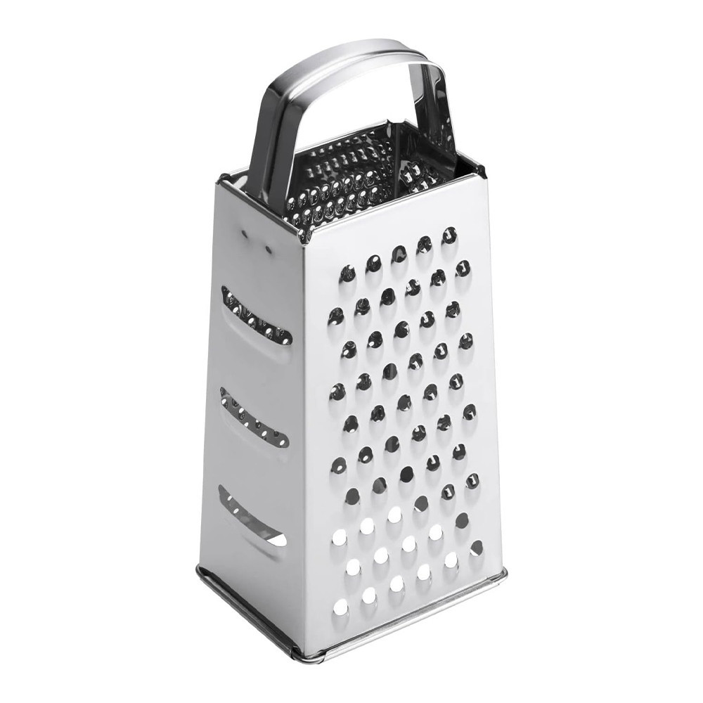 Klasszikus négyszög alakú reszelő az összes hagyományos reszelési funkcióval, a tetején nagy méretű fogantyúval