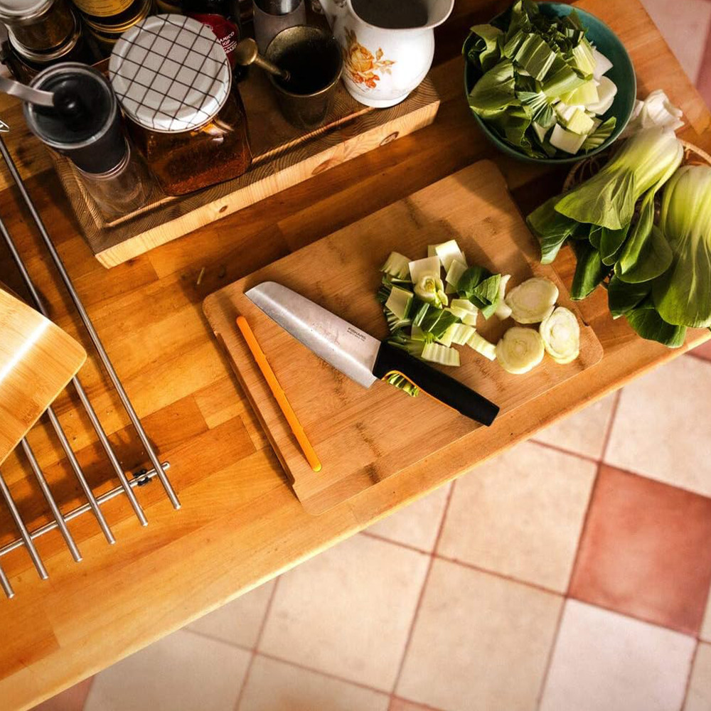 A Fiskars Functional Form Santoku kés egy széles pengével ellátott, ázsiai stílusú általános kés, kényelmes használni és könnyű kezelni
