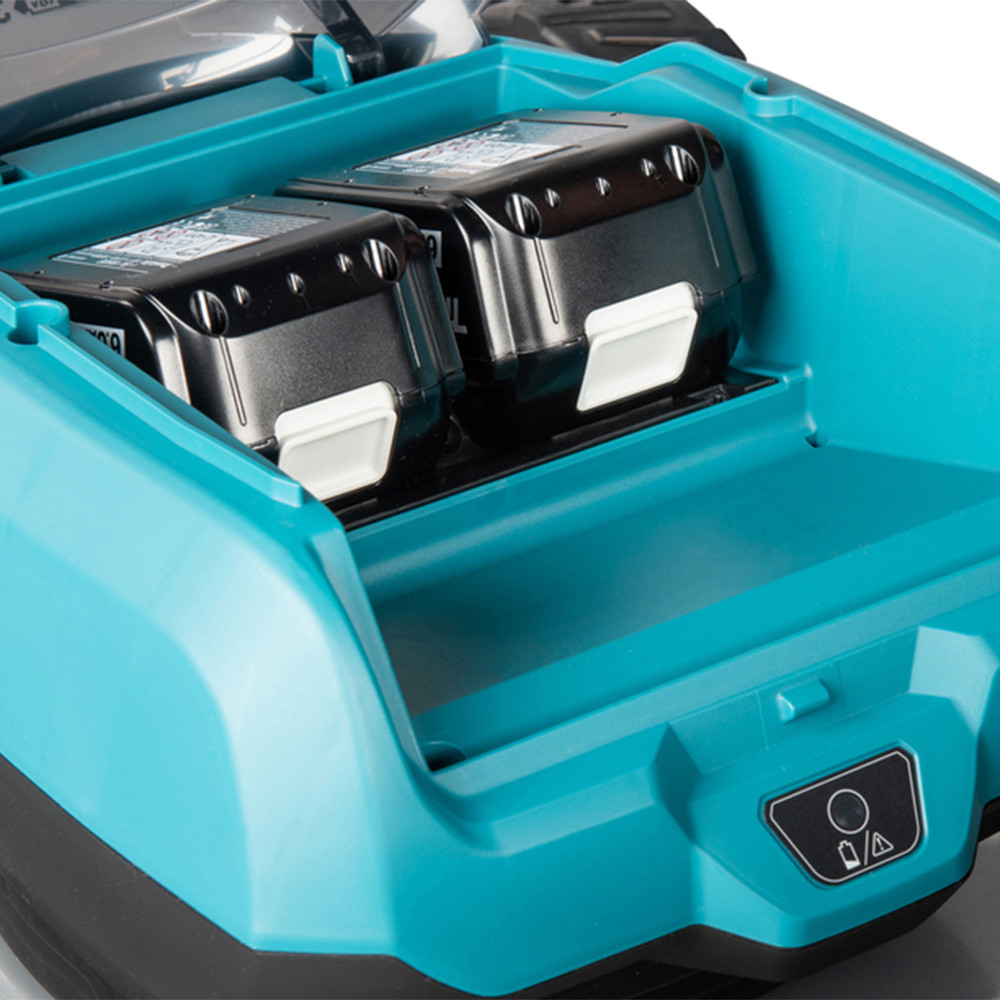 A fűnyíró két 18 V-os LXT akkumulátorral (BL1860B) akár 900 m², két nagy kapacitású 18 V-os LXT akkumulátorral (BL18120) pedig akár 1920 m² területet is képes lenyírni