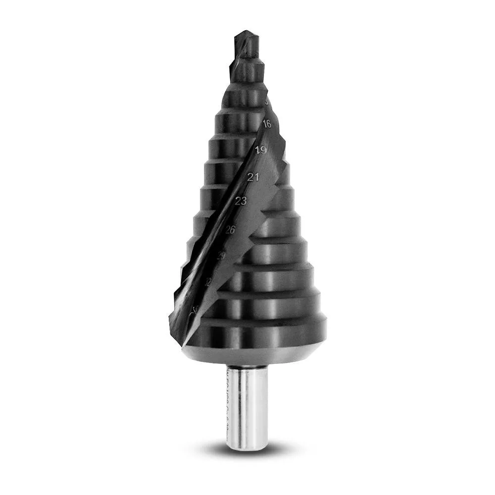Fúráslépcsők: 6 - 9 - 13 - 16 -19 - 21 - 23 - 26 - 29 - 32 - 35 - 38 mm Edzett, kiváló minőségű gyorsacélból kobalt tartalommal és titánium-alumínium bevonattal Sorja mentes megmunkálás Önközpontosító tulajdonság Ötvözetlen és ötvözött acélhoz - 1400N/mm² szakító szilárdságig Fém, acélöntvényhez Lágy öntvényhez Műanyaghoz Előfúrás nélkül vékony lemezhez Peremsüllyesztéshez