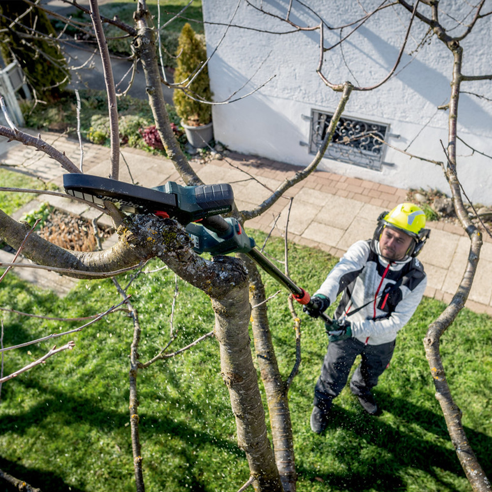 Az MS Kihúzható nyéllel kombinálva (tartozék) a mini motoros fűrész magassági ágvágóként is használható
