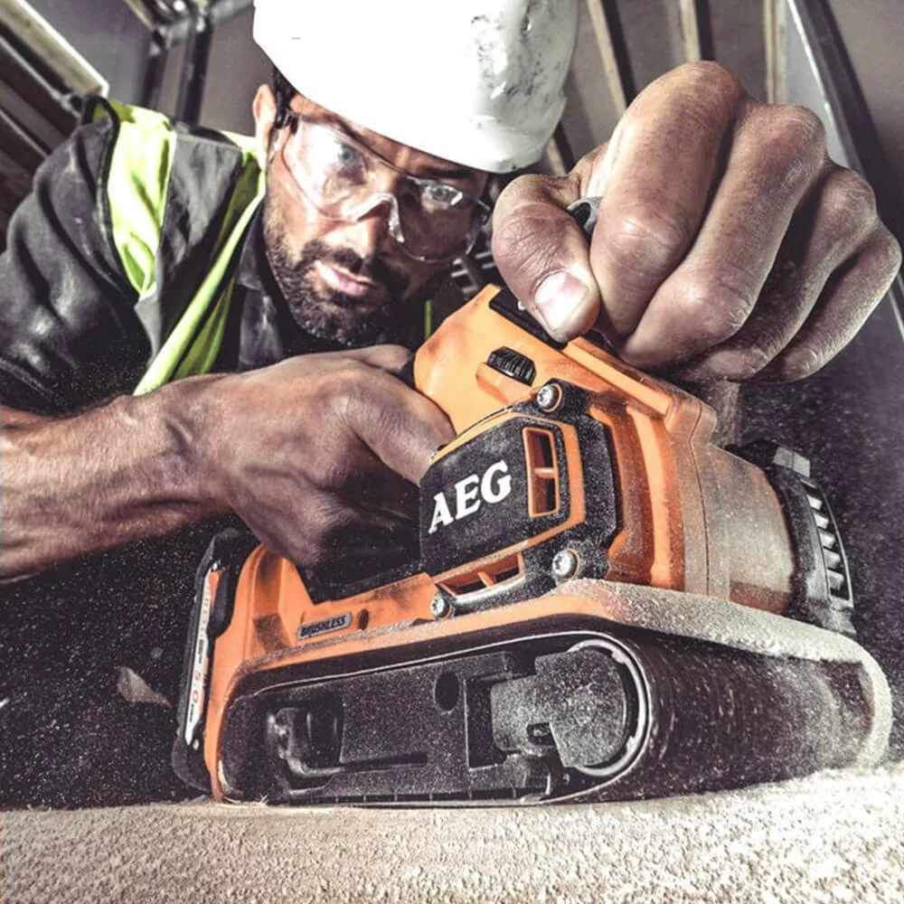 Aeg BHBS18 75BL-0 akkus szalagcsiszoló alapgép 1 db 120-as csiszoló szalag 1 db 80-as csiszoló szalag Akkumulátor és töltő nélkül Kartondoboz
