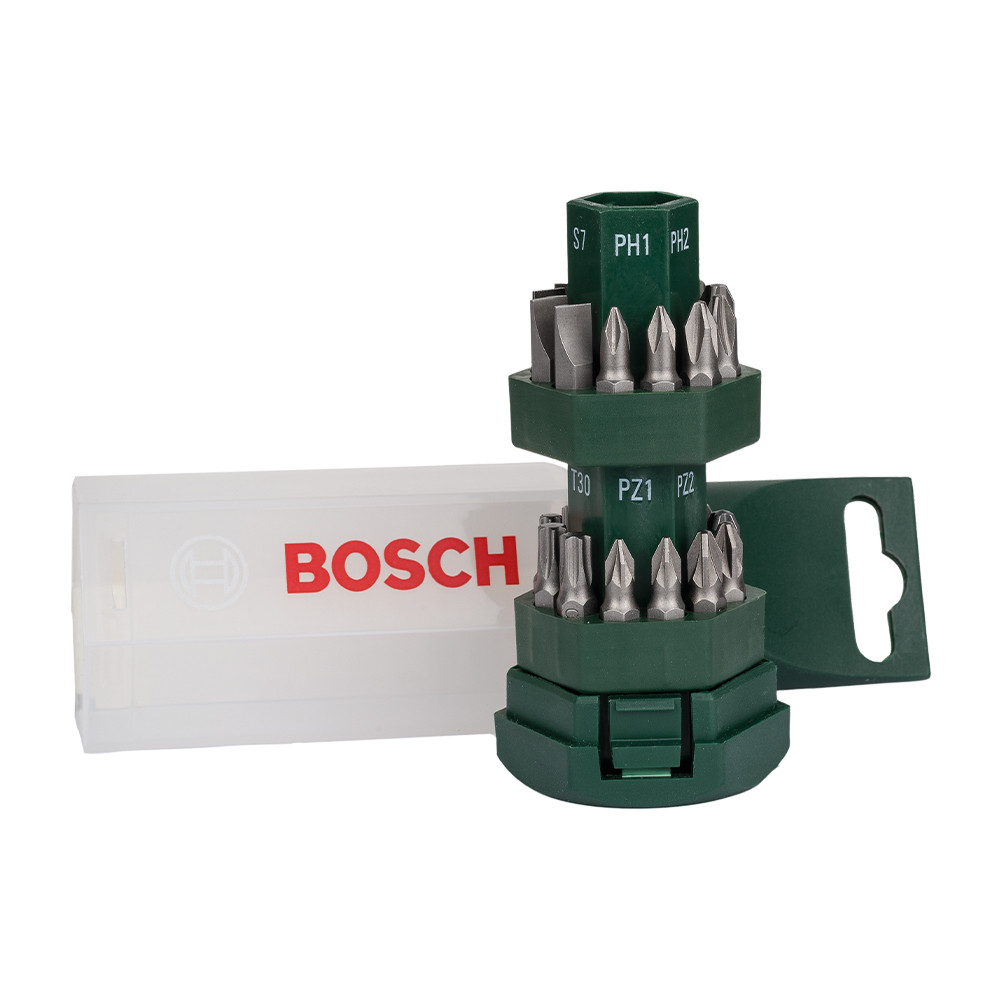 Bosch bitkészlet24 csavarozófejH = 25 mm PH 1/1/2/2/3/3 PZ 1/1/2/2/3/3 S 4/4/6/6/7/7 T 20/20/25/25/30/301 x mágneses tartóKartondoboz