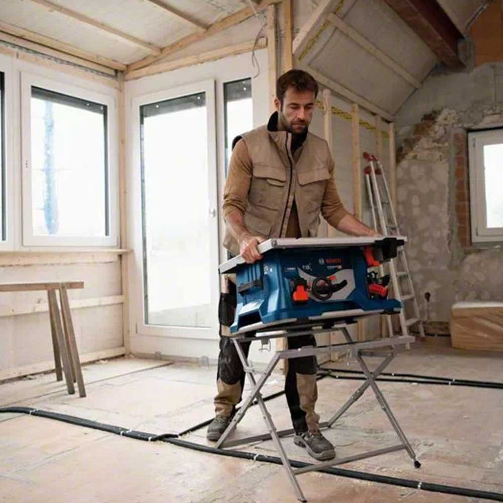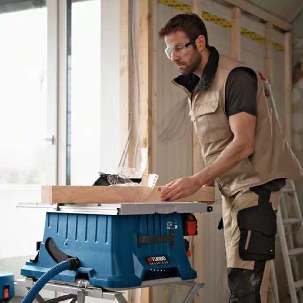 Bosch GTS 18V-21 akkus asztali körfűrész alapgép Akkumulátor és töltő nélkül 1 db fűrészlap 1 db késvédő 1 db leszabóidom 1 db párhuzamos ütköző 1 db tolórúd Kartondoboz