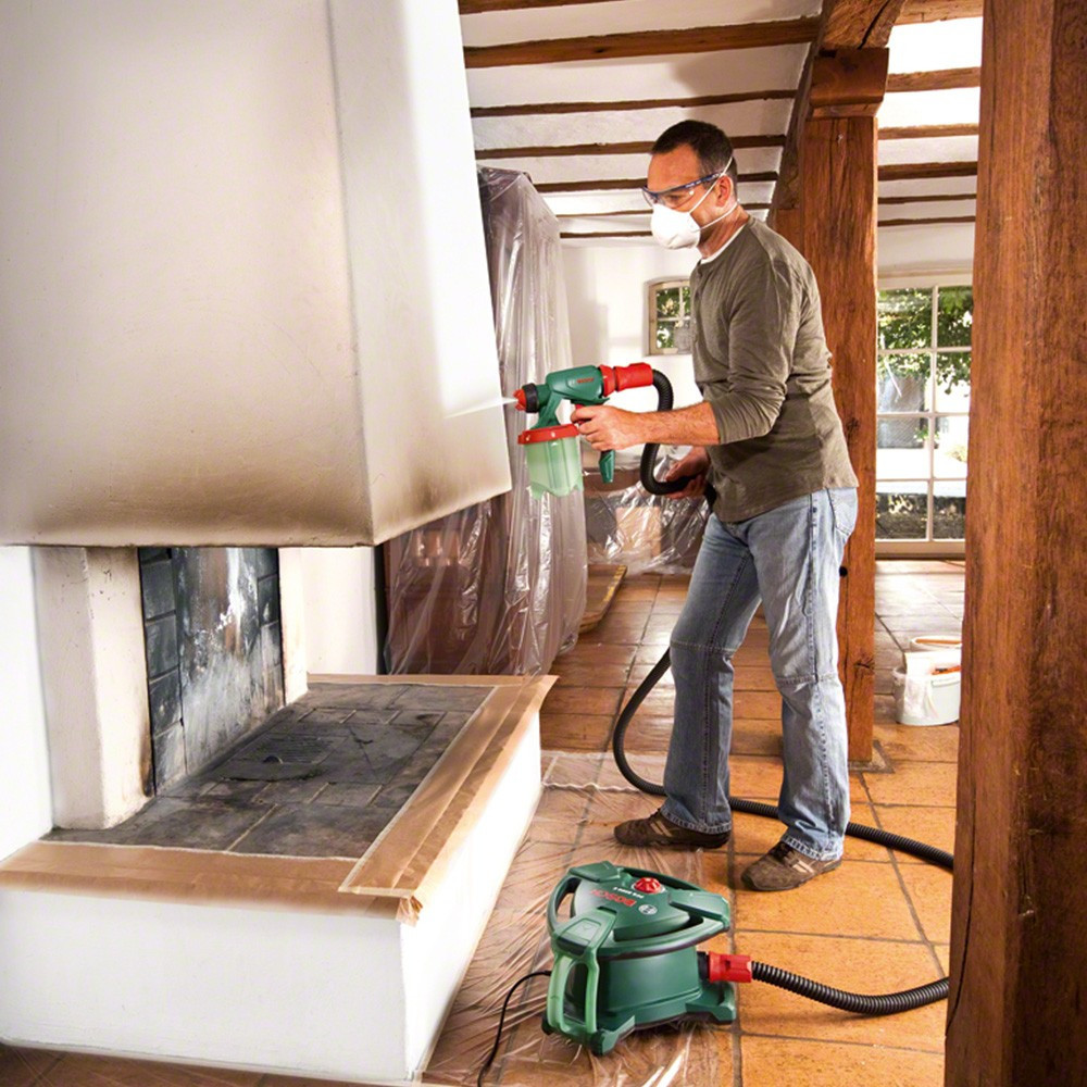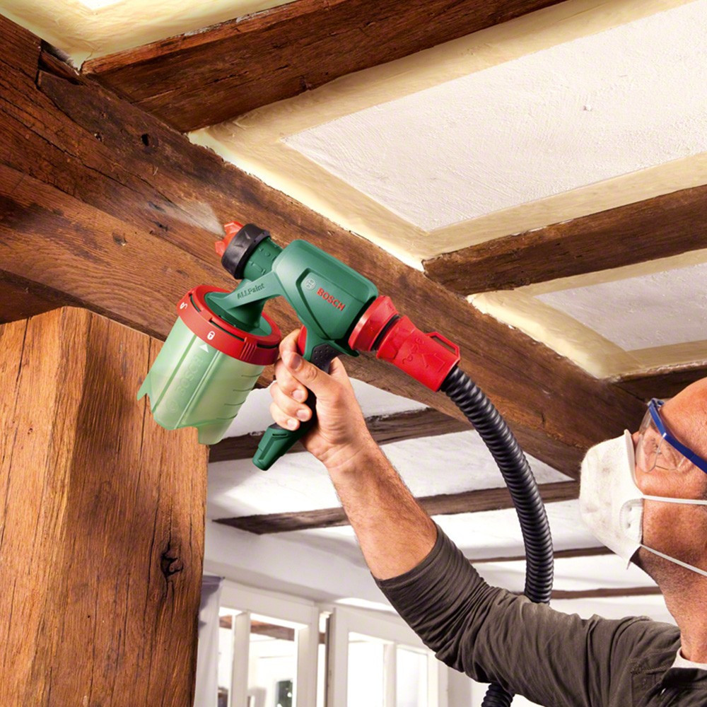 Bosch PFS 5000 E festékszóróFúvóka falfestékhez (fehér)Fúvóka lakkfestékhez (fekete)Fúvóka (szürke)TisztítókefeFestékszűrő2 x 1000 ml-es festéktartály fedéllel (1 600 A00 1GG)Kartondoboz