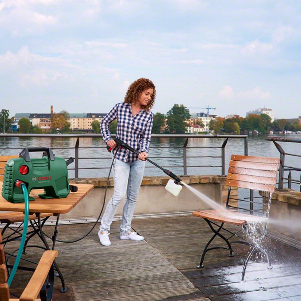 Bosch EasyAquatak 120 nagynyomású tisztító 5 méteres tömlő Fokozatmentesen állítható fúvóka Forgófejes fúvóka Lándzsa Magasnyomású tisztítószer fúvóka (450 ml) Vízszűrő Kartondoboz