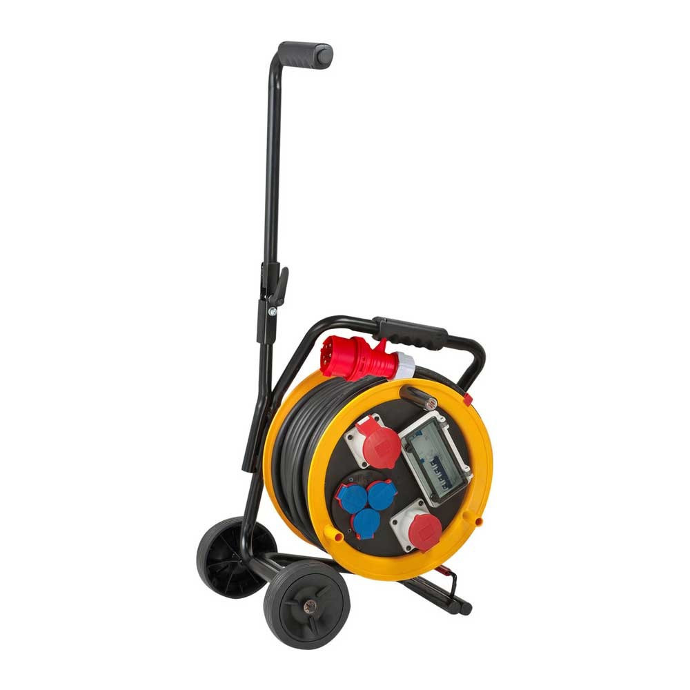 Brennenstuhl Brobusta ipari kábeldob IP44 szállítókocsival, 30mCEE-dugó 400 V/32 A 5-pólusúCEE-dugó 400 V/32 A 5-pólusú,CEE-dugó 400 V/16 A 5-pólusú,3 fröccsenő víztől védett földelt dugalj 230 V4-pólusú biztonsági lekapcsolással és túlhevülés elleni védelemmelFI hibaáram-védőkapcsoló 30 mA1 biztosító automata 400 V/16 A,1 biztosító automata 230 V/16 A