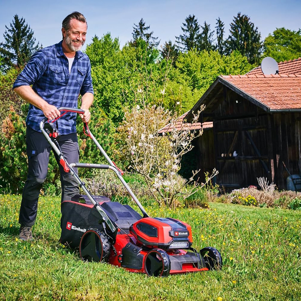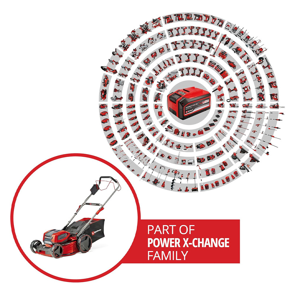 Ha az Einhell nagy teljesítményű GP-CM 36/47 S Li BL (4x 4,0Ah) akkumulátoros fűnyíróját választja, akkor biztos lehet abban, hogy a fűnyírás könnyű, a végeredmény pedig kifogástalan lesz. A fűnyírót Einhell PurePOWER szénkefe nélküli motorral szerelték fel. A szénkefe nélküli motorok nagyobb erőátvitelt és hosszabb üzemidőt garantálnak, mint a szénkefével gyártott társaik. Ezekre a motorokra – online regisztrációt követően – 10 év jótállást vállalunk. A nagy teljesítményű akkumulátoros fűnyíró a Power X-Change termékcsalád tagja, melynek valamennyi eleme – beleértve az összes akkut, készüléket és töltőt – kombinálható egymással. A kétfokozatú intelligens fordulatszám-szabályozó elektronika mindig az alkalmazás intenzitásának megfelelő fordulatszámot biztosít. A munka elvégzéséhez szükséges energiát a 36 V dupla Twin-Pack technológia adja, amely négy nagy teljesítményű 18 V akku erejét egyesíti a hosszabb használat érdekében. Az ECO-üzemmód még hosszabb üzemidőt biztosít.