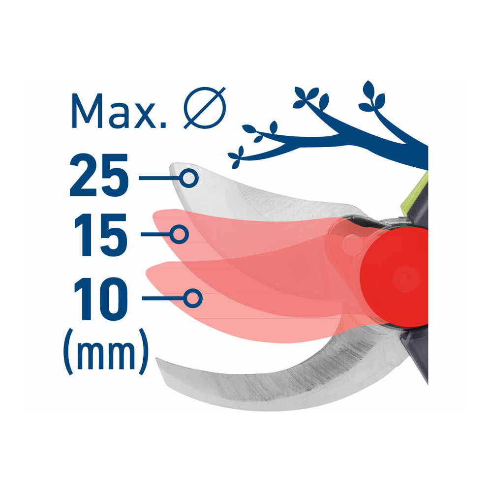 Az akkumulátoros metszőolló lehetővé teszi a fák és bokrok ágainak és növényi szárak egyszerű vágását akár 25 mm átmérőig