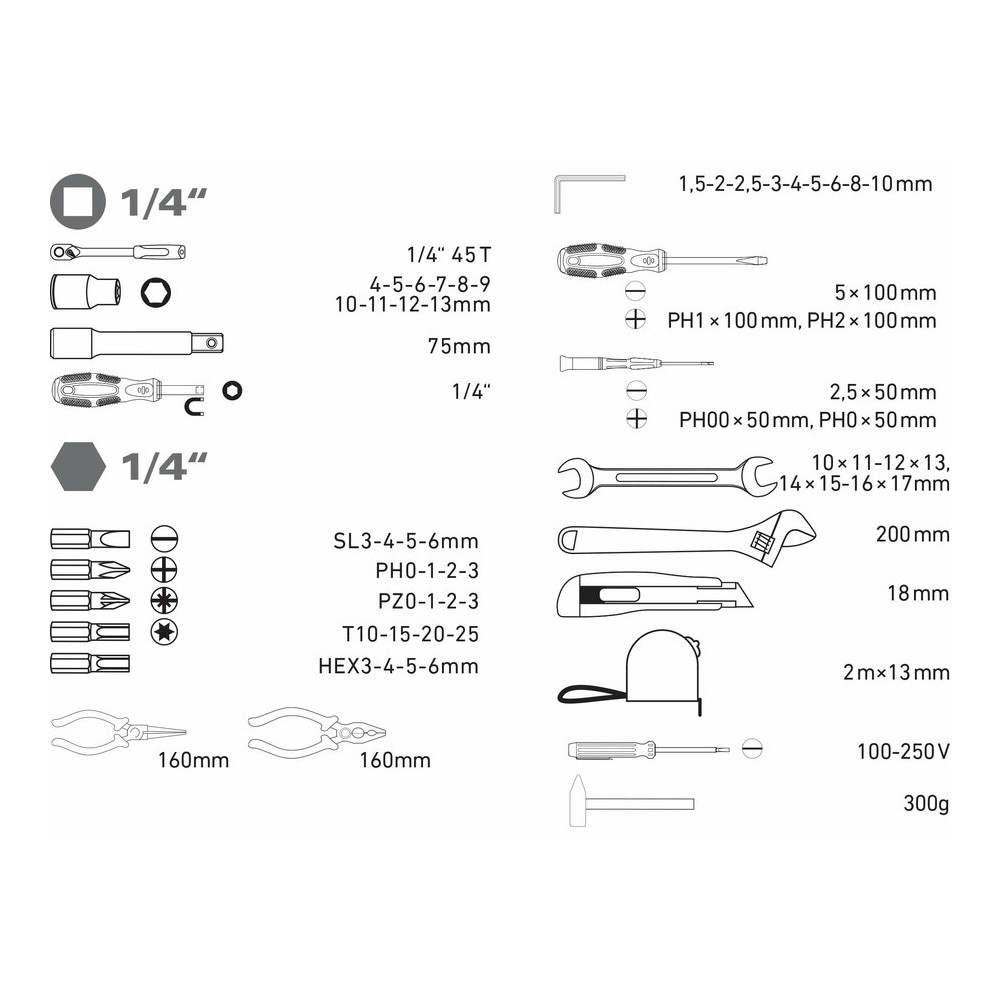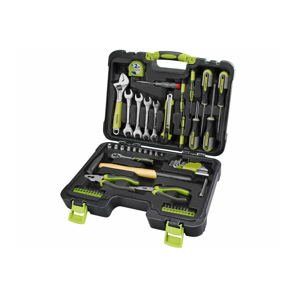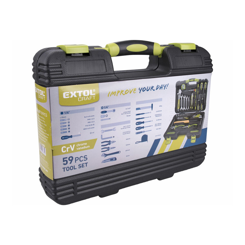 Az Extol Craft szerszámkészlet praktikus és kompakt műanyag tartóban kapható, mely lehetővé teszi a szerszámok biztonságos és kényelmes tárolását és szállítását