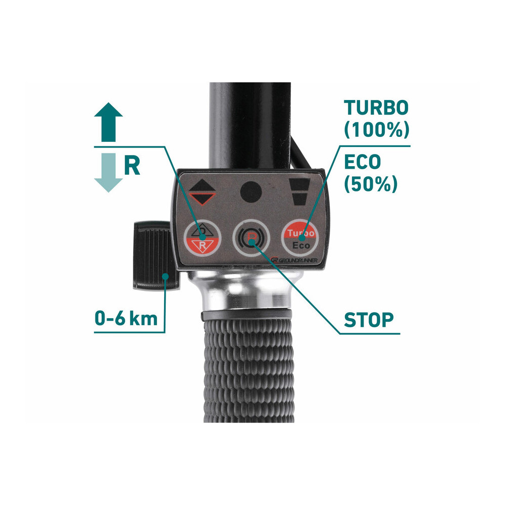 A talicska a jobb oldali fogantyún lévő kezelőpanelén a hüvelykujjal könnyedén lehet beállítani a pillanatnyi sebességet