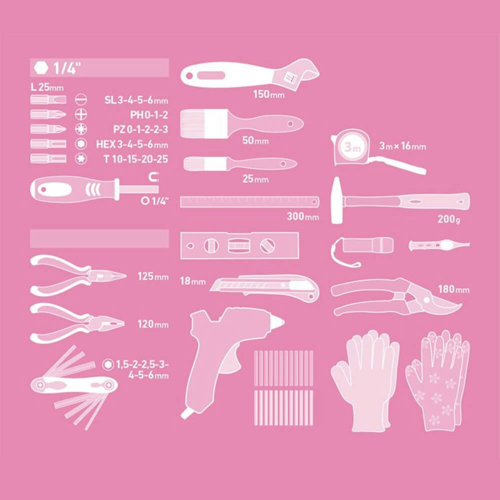 Mágnese 1/4" csavarhúzó markolat BIT-ekhez 1/4" × 25 mm BIT-ek: lapos: 3-4-5-6mm, PH0-1-2, PZ0-1-2-2-3, HEX3-4-5-6, TORX 10-15-20-251 db kalapács 200gImbuszkulcs 1,5-2-2,5-3-4-5-6mmFogók: kombinált- 125mm, rádiós- 125mm1 db állítható villáskulcs 150 mm1db 300 mm-es fém vonalzó1 db vízmérték mágnes talppalmágnes talppal 150 mm-es1 db csipesz LED-el2 db ecset: 50mm és 25 mm1 db mérőszalag: 3 m × 16 mm1 db tapétavágó kés, 18mm1 db LED lámpa (elem nélkül), 60 Lm, (3 db AAA elem szükséges hozzá)1 db melegragasztó pisztoly, 25W, 7,2 mm 12 db ragasztóstift, kevert színű (fehér, fekete, kék, zöld, sárga, vörös) 12 db ragasztóstift, áttetsző/színtelen1 db 180 mm-es metszőolló1 db kerti kesztyű: Nylon/Nitrilbe mártott, 7' méret1 db munkakesztyű: PE/pöttyökkel1 db műanyag táskában