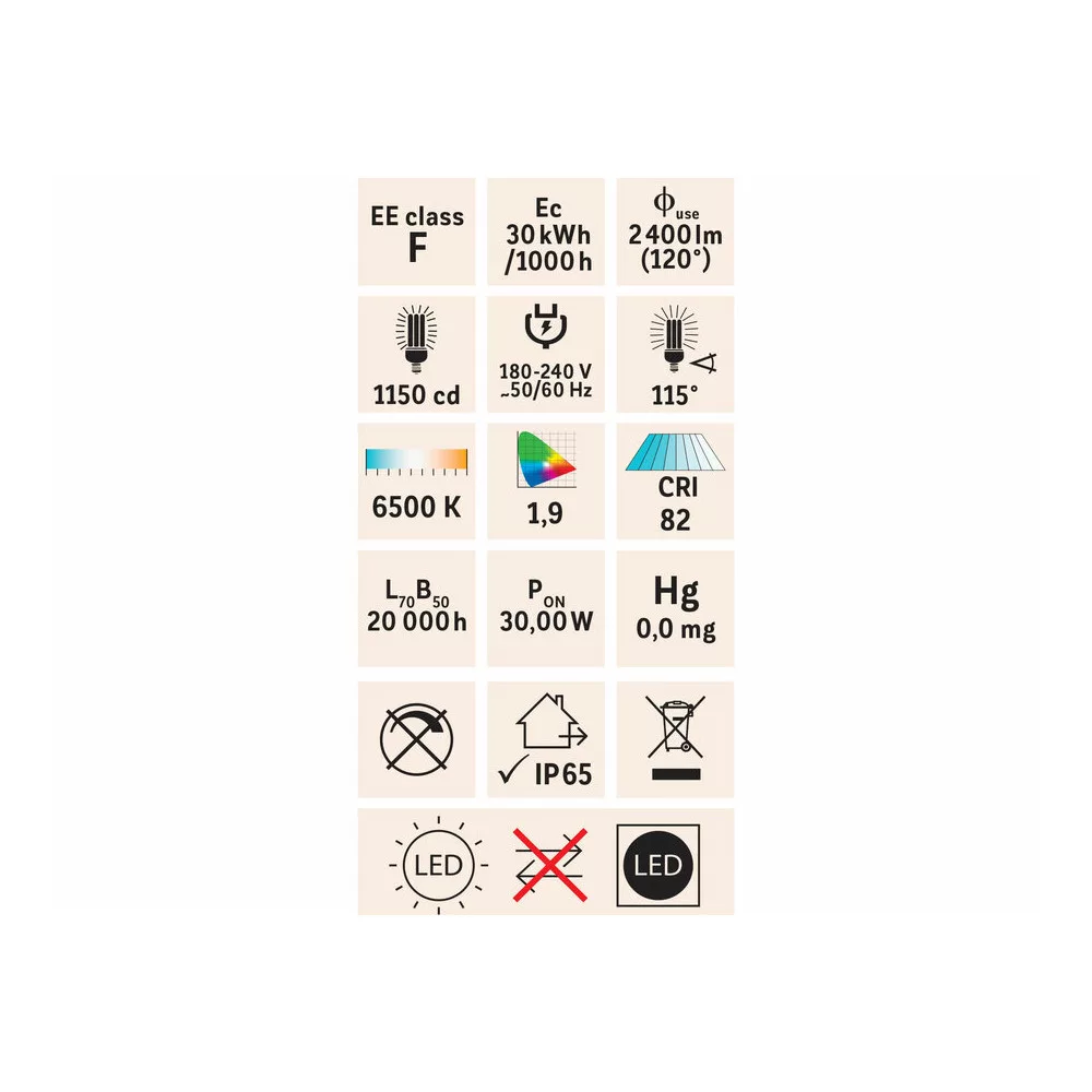 30W, megfelel kb. 260W hagyományos izzó fényerejének