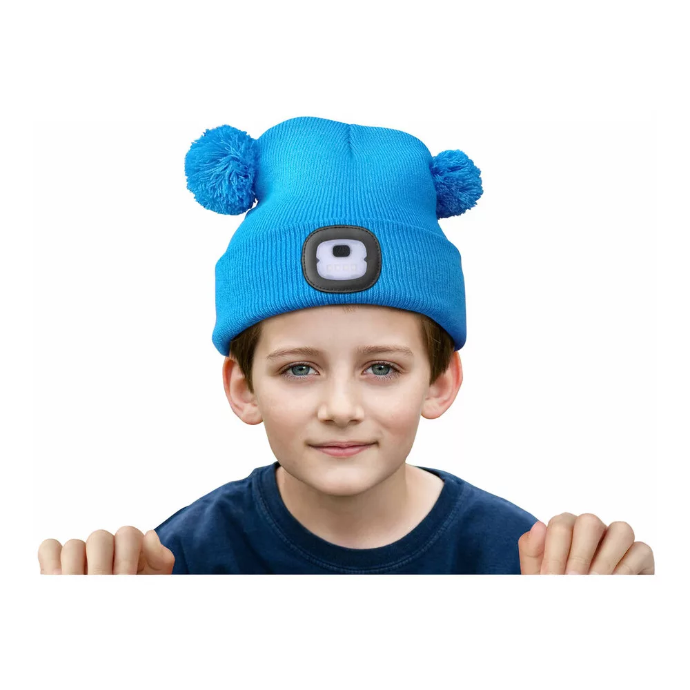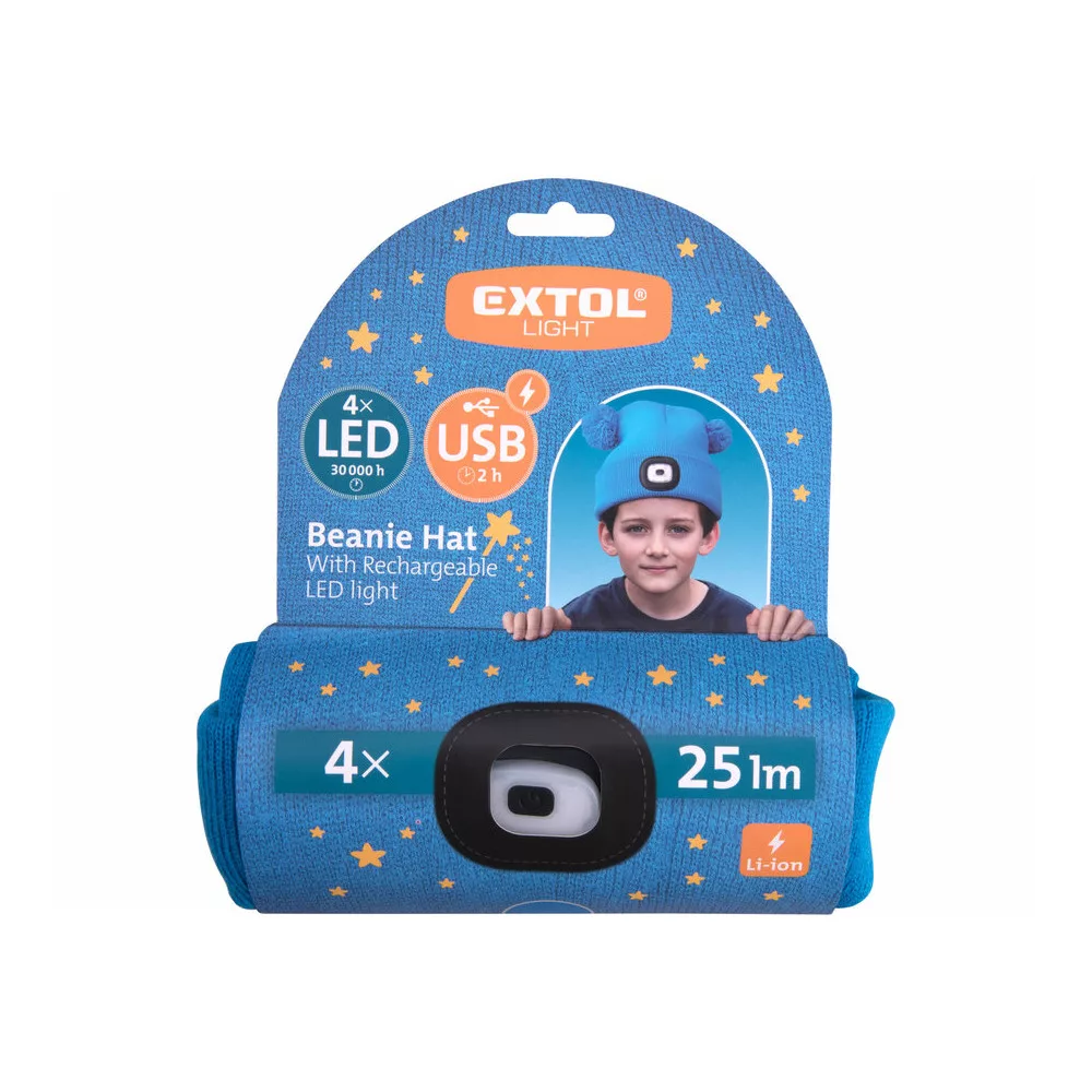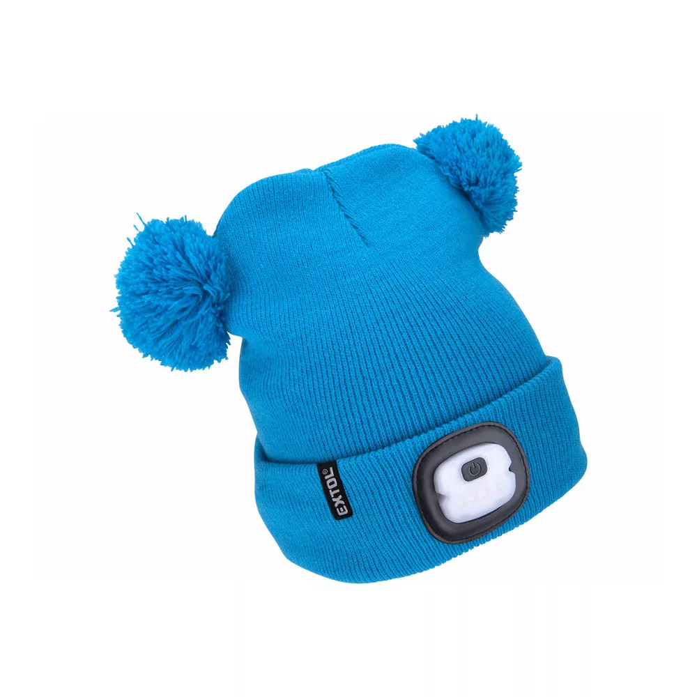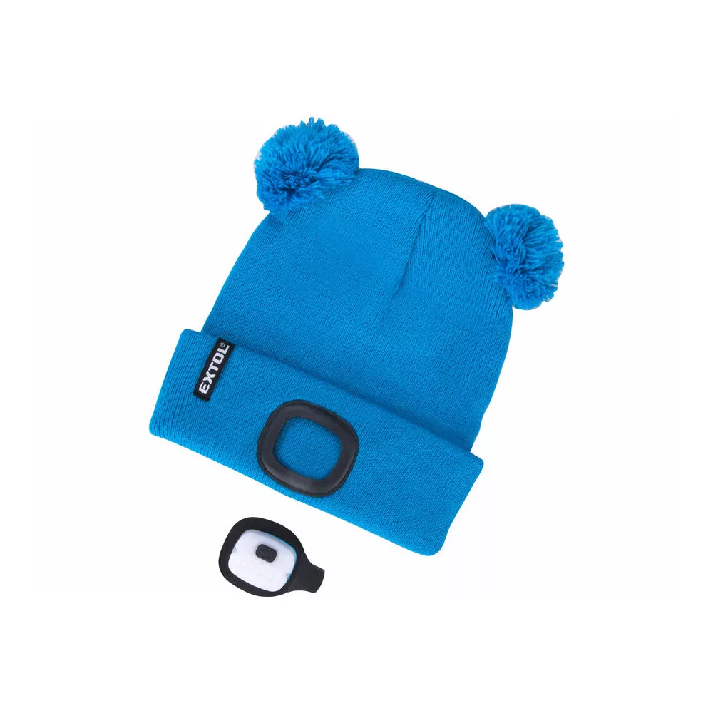 Extol Light sapka, gyerek, kék, kötött, kivehető LED homloklámpával, 4×25 Lumen; USB tölthető Li-