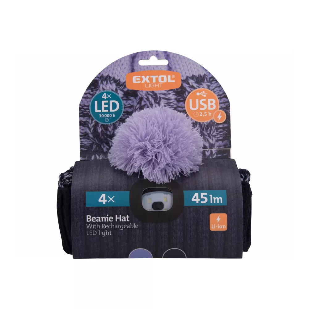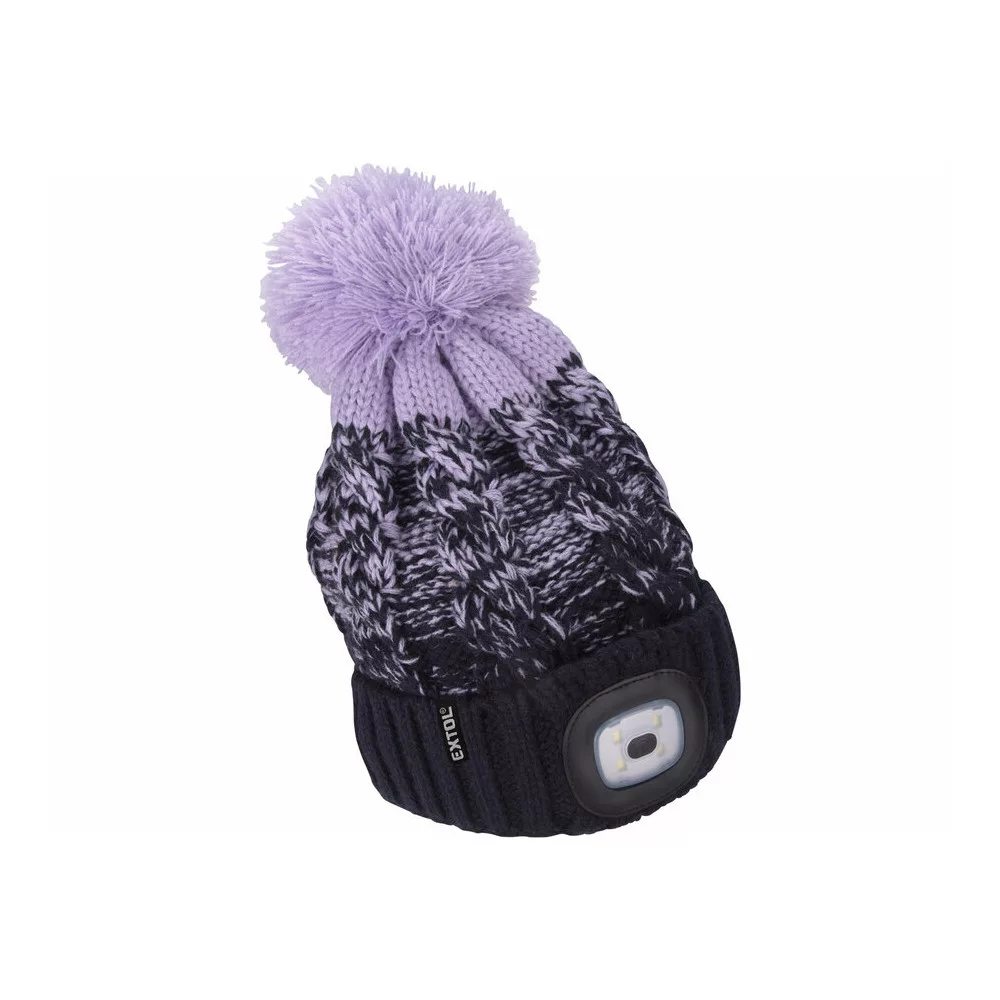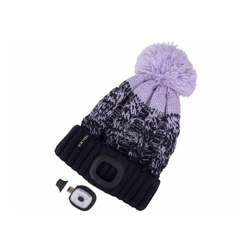 Extol Light sapka, kék/lila pomponnal, kötött, kivehető LED homloklámpával, 4×45 Lumen; USB tölth