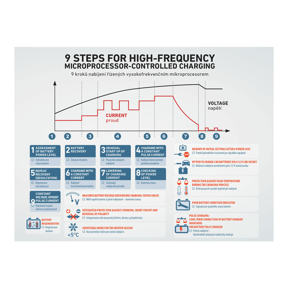 Az a nagyfrekvenciás processzorral vezérelt akkumulátortöltő 9 töltési fázist használva, teljesen automatikusan tölti fel az összes 12 V/6 V-os ólom (ólom-sav típusú) akkumulátort (WET, MF, AGM, GEL), továbbá a 12 V-os lítium-vas- foszfát típusú (LiFePO 4) akkumulátorokat