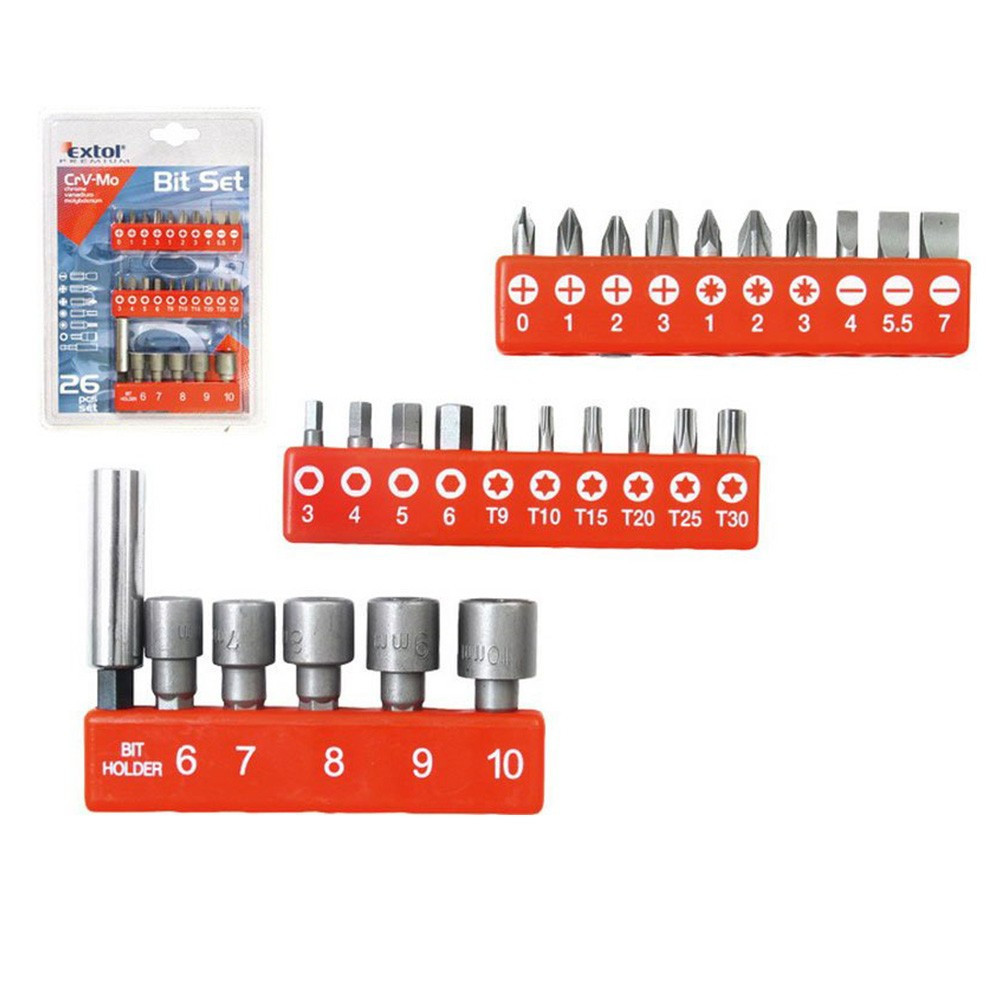 Extol bitkészletLapos bit: 4mm, 5,5mm, 7mmPH bit: 0-1-2-3PZ bit:0-1-2-3Torx bit: 9-10-15-20-30Hatlap bit: 3-4-5-6mmAnyabehajtó szár: 6-7-8-9-10mmMágneses bittartóKartondoboz