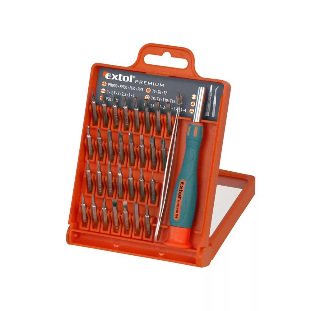 Extol bitkészletTorx: T5, T6, T7, T8Lyukas Torx : T9, T10, T15, T20Lapos: 1, 1,5, 2, 2,5, 3, 4mmPH: 000, 00, 0, 1PZ: 0, 1Hatszög: 1,3, 1,5, 2, 2.5, 3,3.5, 4 mm115mm hosszú mágneses nyél1 db fém csipeszKartondoboz