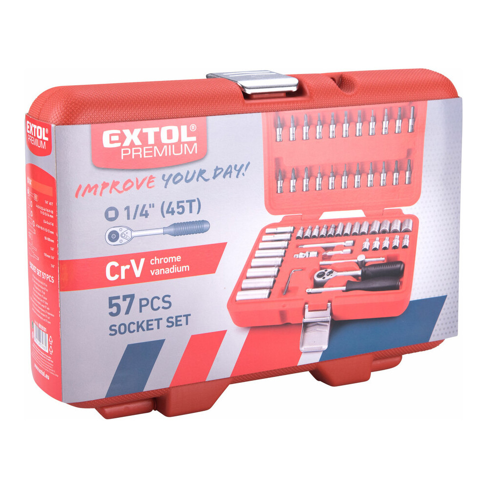 Extol Premium dugókulcs készlet CV., 45fog; 1/4", 57db, dugófejek: 4-14mm, bitdugófej (-, +, imbu