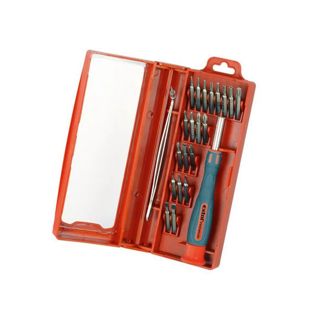 Extol bitkészletlapos 1,5 - 2,0 - 2,5 - 3,0 mmPH 000 - 00 - 0 - 1PZ 0 - 1imbusz H 1,5-2-2,5-3 mmtorx (tömör T) T6 - T7torx (lyukas TTa ) T8 - T10 - T15 - T201 db csavarhúzó markolat bitekhez, mágneses, 115 mm1 db fém csipeszKartondoboz