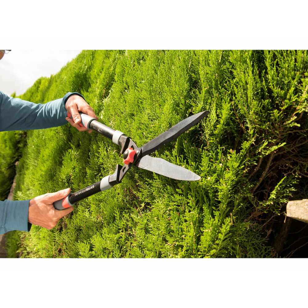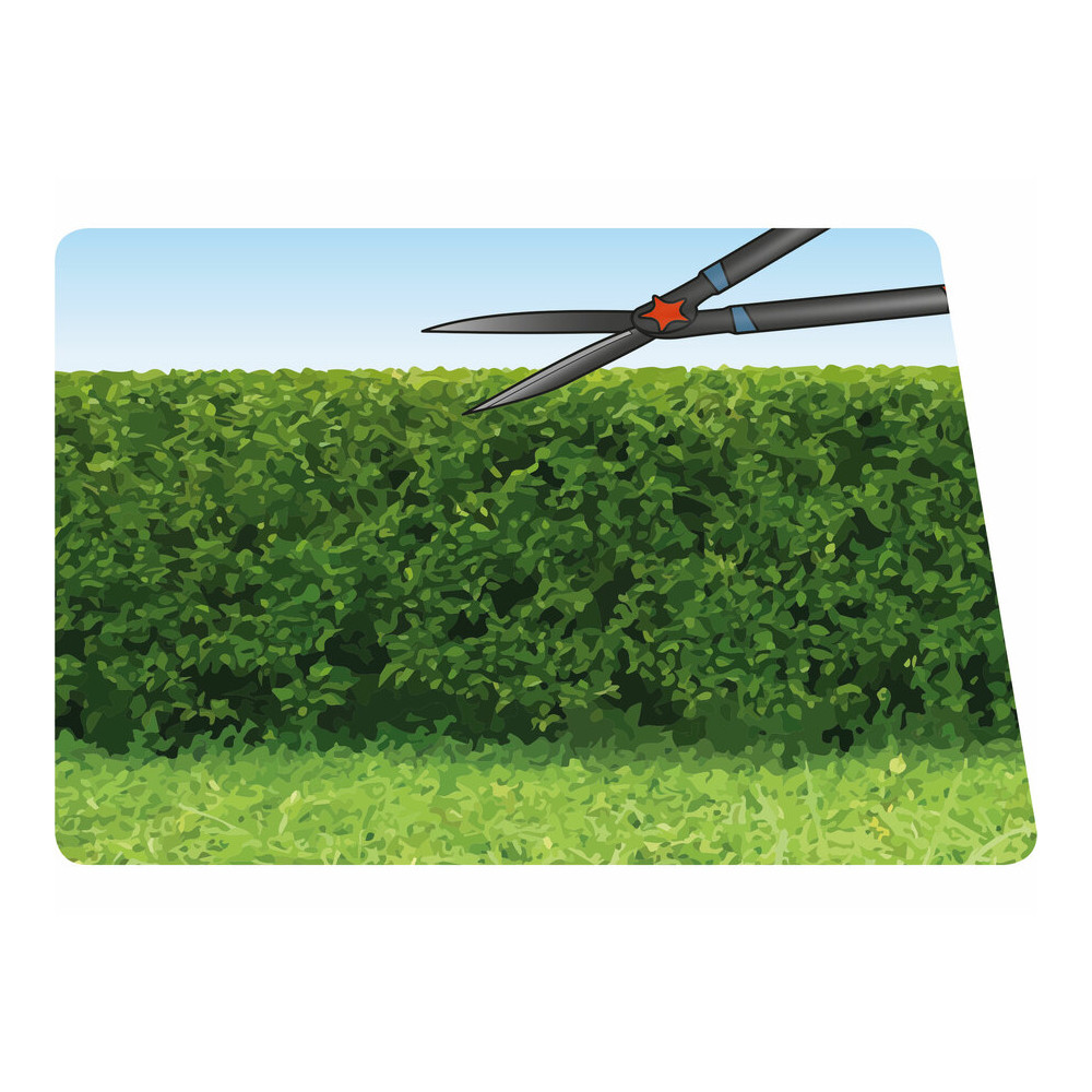 A sövényvágó ellipszis profilú acél nyéllel és gumirozott (puha TPR) műanyag fogantyúval (kemény PP) lett gyártva