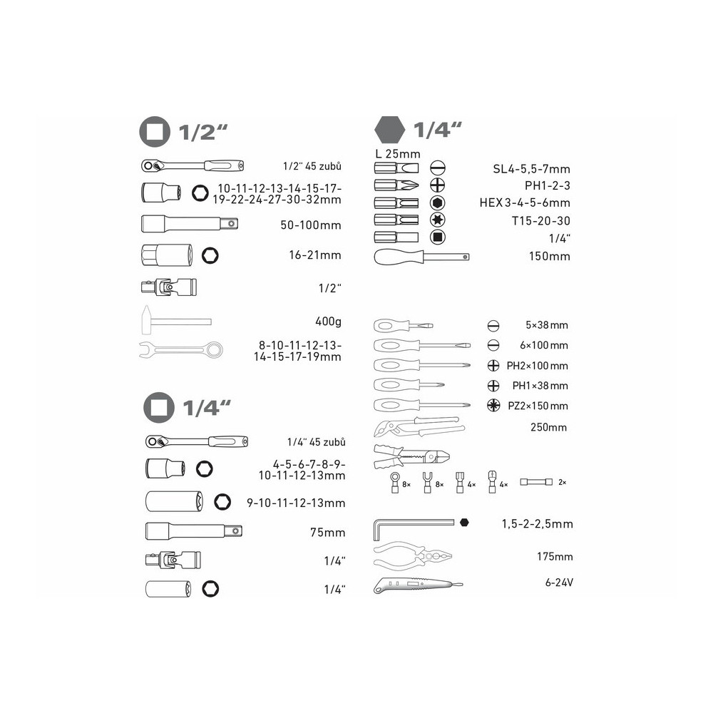Extol Premium szerszám és dugókulcs készlet,100db; 1/4", és 1/2" racs.kar (45 fog), cs-v kulcs, c