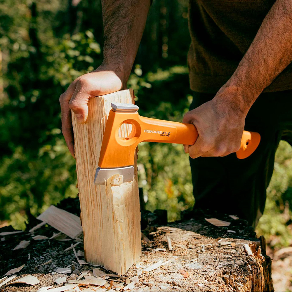A Fiskars X13-os XXS-25 ultrakönnyű kemping fejsze a fej tömegének és a nyél hosszának optimális aránya révén biztosít nagy hasítóerőt