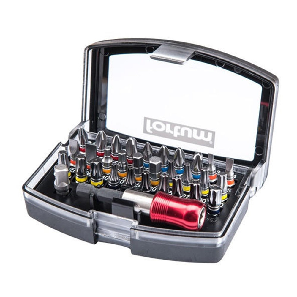 S2 acél, amelyek a típus szerint színjelöléssel vannak megkülönböztetve1db 1/4" automatikus kioldással rendelkező Fix-Clip hegybefogó, 60mm mágneses1db bit adapter 1/4"négyszög x 1/4" hatszög30db bit 25mm: