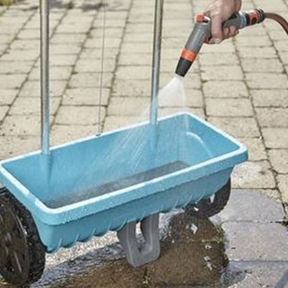 A szórókocsi korrózió- és időjárásálló anyagból készült; egyszerűen, vízzel tisztán tartható