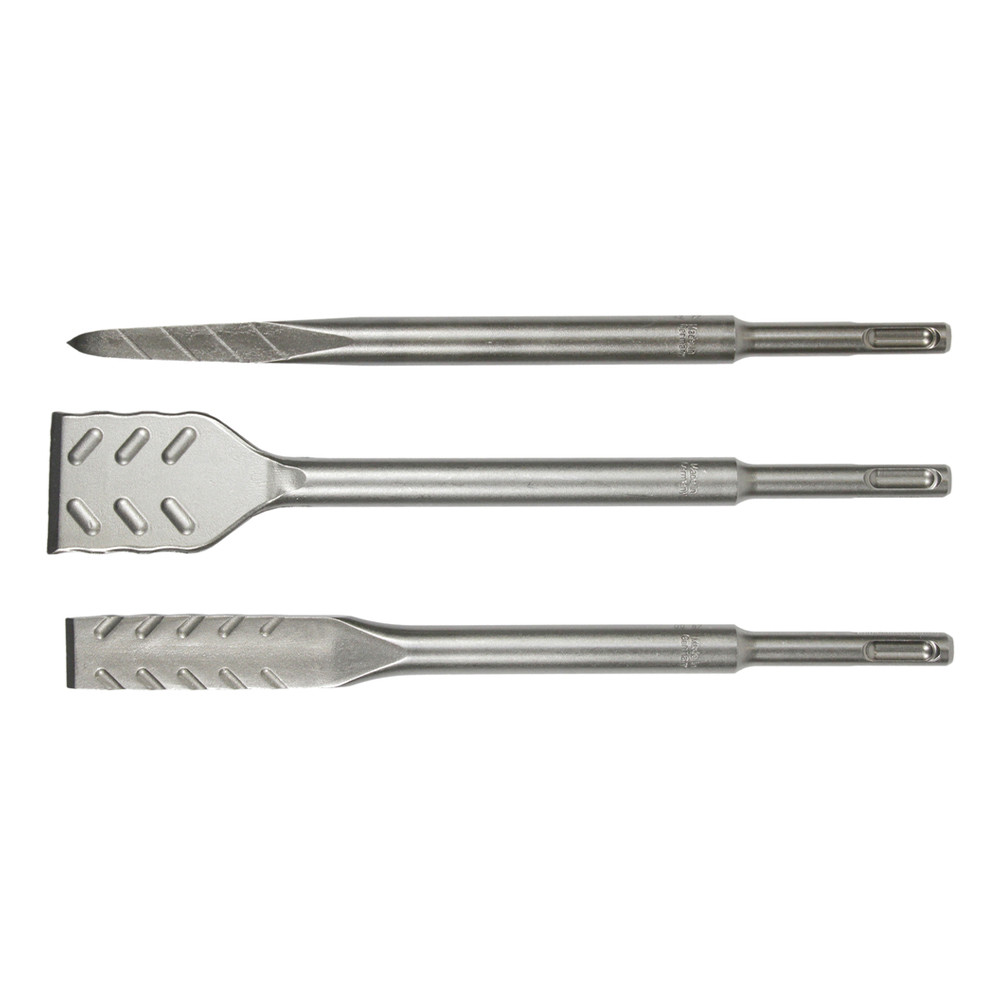 Nagy hatékonyságú, hosszú élettartamú vésőkészlet, amely tartalmaz 1 x 250 mm-es hegyes vésőt, 1 x 20 x 250 mm-es lapos vésőt és 40 x 250 mm-es széles vésőt