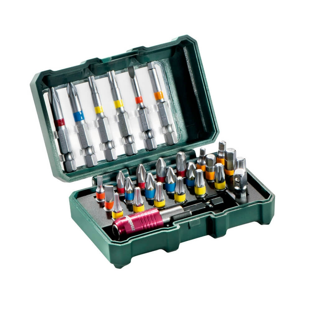 Metabo bitkészletL = 25 mm (21 db.): PH 1 x 1, PH 2 x 2, PH 3 x 1PZ 1 x 1, PZ 2 x 2; PZ 3 x 1SL 3 x 1, SL 5 x 1H 3 x 1, H-4 x 1, H-5 x 1; H 6 x 1T 10 x 1, T 15 x 1, T 20 x 2, T 25 x 1, T 30 x 1, T 40 x 1L = 50 mm (6 db.): PH 2 x 1PZ 2 x 1T 20 x 1, T 25 x 1SL 4.5 x 1H-4 x 11 x adapter 1 x mágneses bittartóKartondoboz