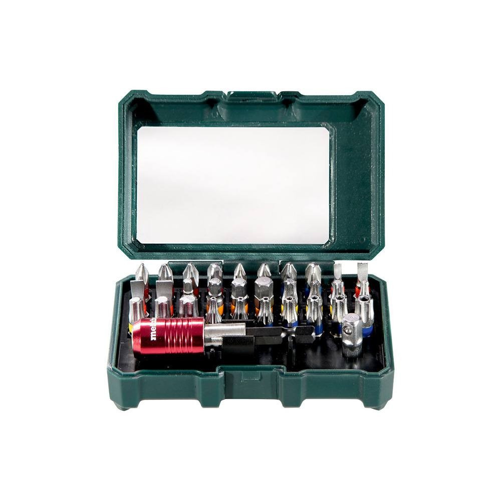 Metabo bitkészlet: PH 1 x 1, PH 2 x 2, PH 3 x 1 PZ 1 x 1, PZ 2 x 2, PZ 3 x 1 SL 3, SL 4, SL 5, SL 6 H 3, H 4, H 5, H 6 T 10, T 15, T 20, T 25, T 27, T 30, T 40 Torx: T 10, T 15, T 20, T 25, T 27, T 30, T 40 1 db adapter 1 db mágneses bittartó (65 mm) Állítható övcsipesz Kartondoboz