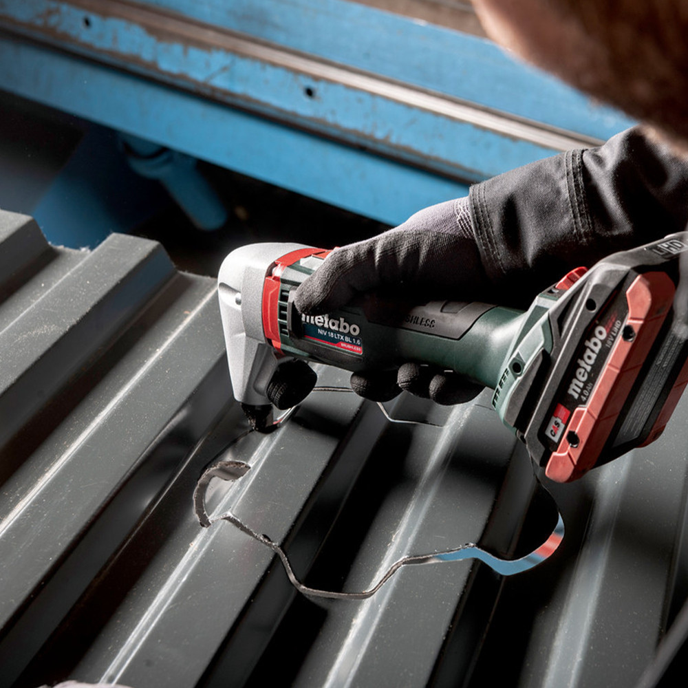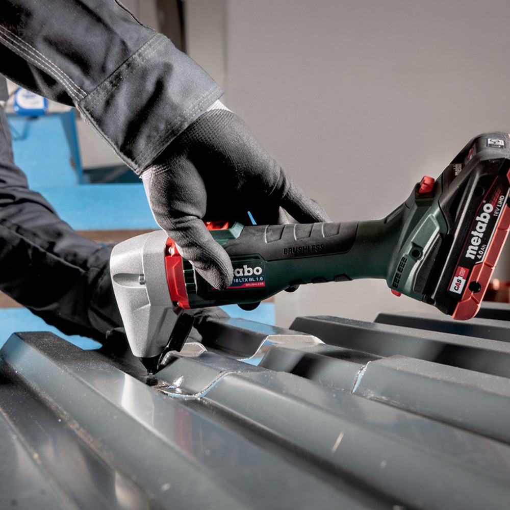 Fáradtságmentes vágásokhoz a formázott és lapos lemezeknél könnyen kezelhető, nagy teljesítményű akkus lemezvágóKitűnő ívjáróság a 40 mm-nél nagyobb sugárral való szélezésekhez és belső kivágásokhoz Vágó berendezés villámgyors, szerszám mentes beállítása 360°-ig 45°-os lépésekben Szénkefe nélküli (BL) motornak köszönhetően, nagy előtoló erő a hatékony munkában való gyors munkavégzéshezAnyaghoz és a munkához illő individuális beállítás érdekében, fokozatmentesen beállítható vágássebesség Szikramentes és szerszámmentes vágásokVékony markolati felületnek és a felül lévő kapcsolónak köszönhetően, kellemes kezelhetőség, kis súly Metabo Quick a szerszám nélküli bélyegek és matricák gyors cseréjeHosszú élettartam érdekében, elektronikus túlterhelés elleni védelem Forgácsokkal való érintkezés okozta rozsdásodás elleni védelme érdekében, forgácsgyűjtő zsákkal ellátvaSzerszámkofferben könnyű a szállítás és a tárolás