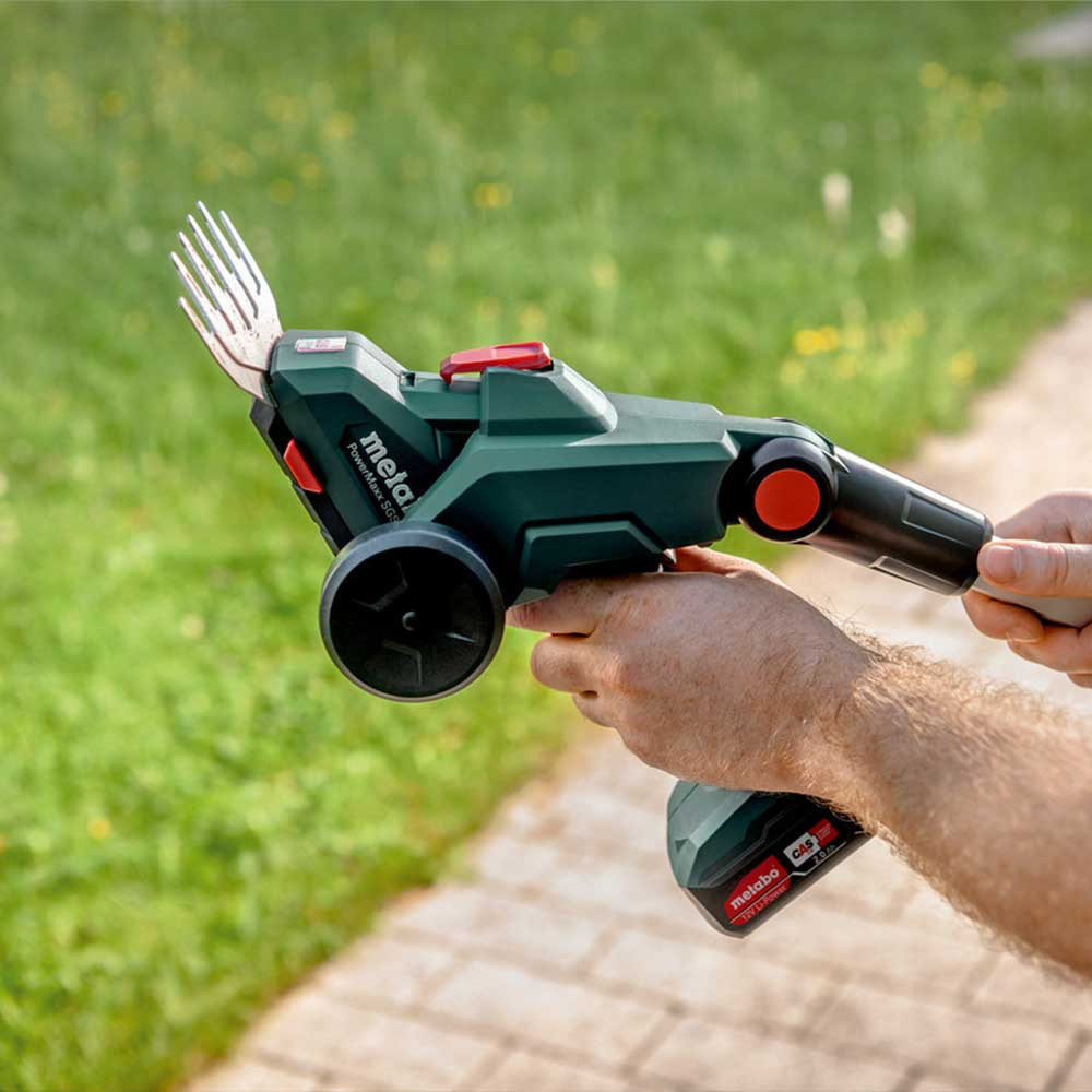 Metabo PowerMaxx SGS 12 Q akkus fű- és bokorvágó. 2 az 1-ben: Bokorvágó olló a bokrok pontos alakra vágásához és fűnyíró olló a tiszta fűszélekhez