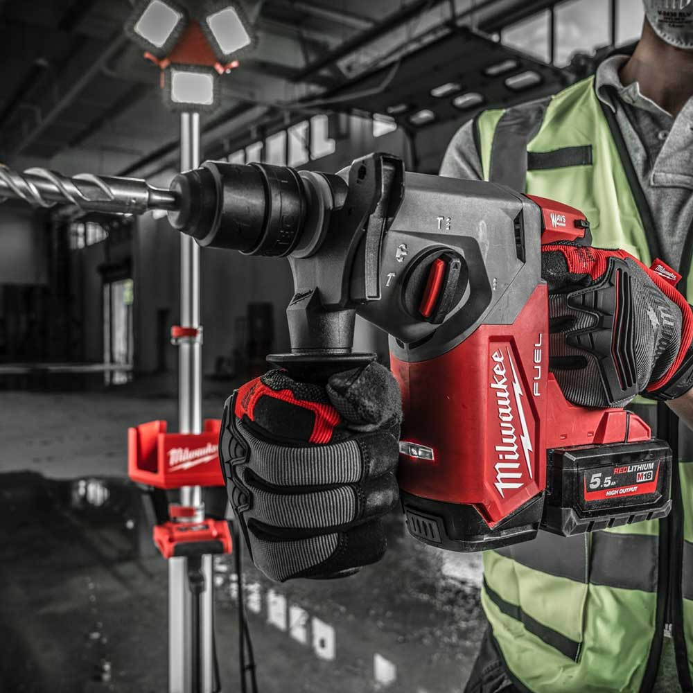 Milwaukee SDS-Plus vésőkalapács M18 FHX-552X 2 db 5,5 Ah akkumulátor 1 db akkumulátor töltő 1 db pótfogantyú 1 db mélységmérő 1 db FIXTEC 13 mm fém tokmány Szerszámkoffer