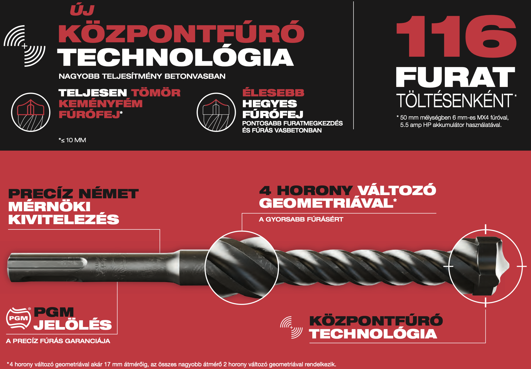 A MILWAUKEE® célja, hogy a lehető legjobb munkafeltételeket biztosítsa, és megkönnyítse a munkát még a legnehezebb körülmények között is. A gyártó jelentős erőforrásokat fordít termékei folyamatos fejlesztésére, kezdve azzal, hogy alaposan megérti a munkahelyi kihívásokat.Ennek a szemléletnek az eredményeként született meg a következő generációs MX4™ fúrószár, amely új mércét állít a fúrószár-technológiában. A tömör keményfém fúrófej hosszabb élettartamot biztosít, míg a Target Tip központfúró-technológia a hegyesebb szögű csúccsal nagyobb pontosságot és gyorsabb furatkezdést tesz lehetővé – még a legkeményebb anyagok fúrásakor is.Az MX4™ jelölés ma az SDS-Plus és SDS-Max fúrószárak etalonja, ami jól mutatja, hogy a MILWAUKEE®-nál minden apró részletre odafigyelnek.