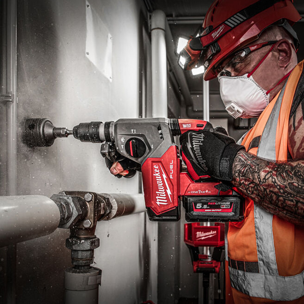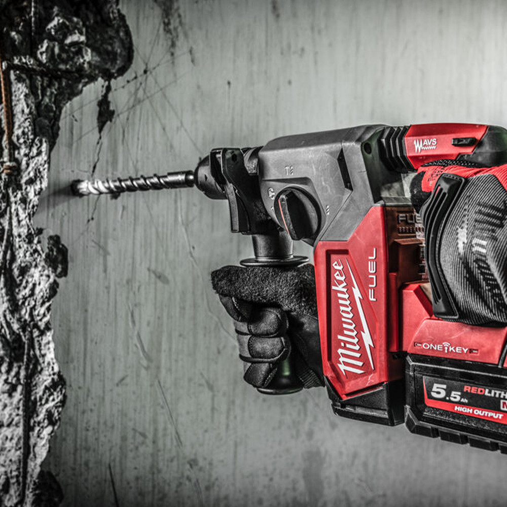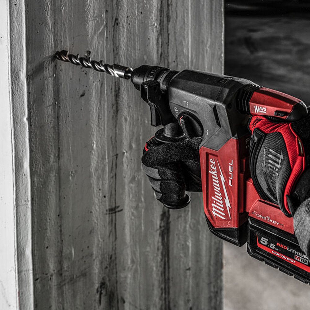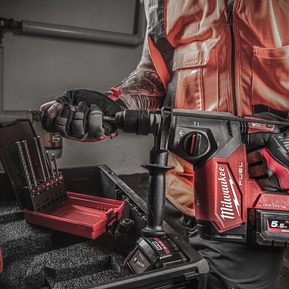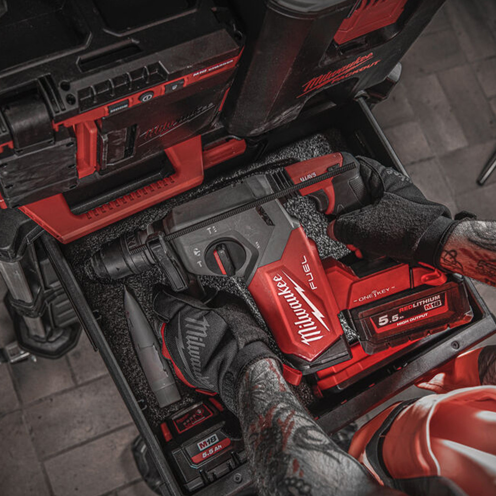 Milwaukee M18ONEFHX-0X akkus kalapács 2 db 5,5Ah akkumulátor 1 db akkumulátor töltő 1 db pótfogantyú 1 db mélységmérő 1 db FIXTEC 13 mm fém tokmány Szerszámkoffer
