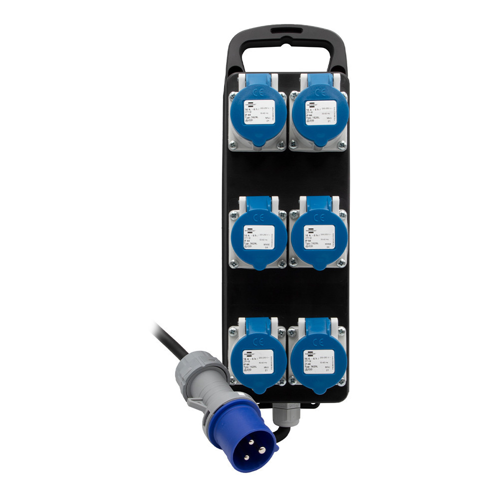 6 db 3 pólusú CEE csatlakozóaljzat, 230V/16A (IP44).