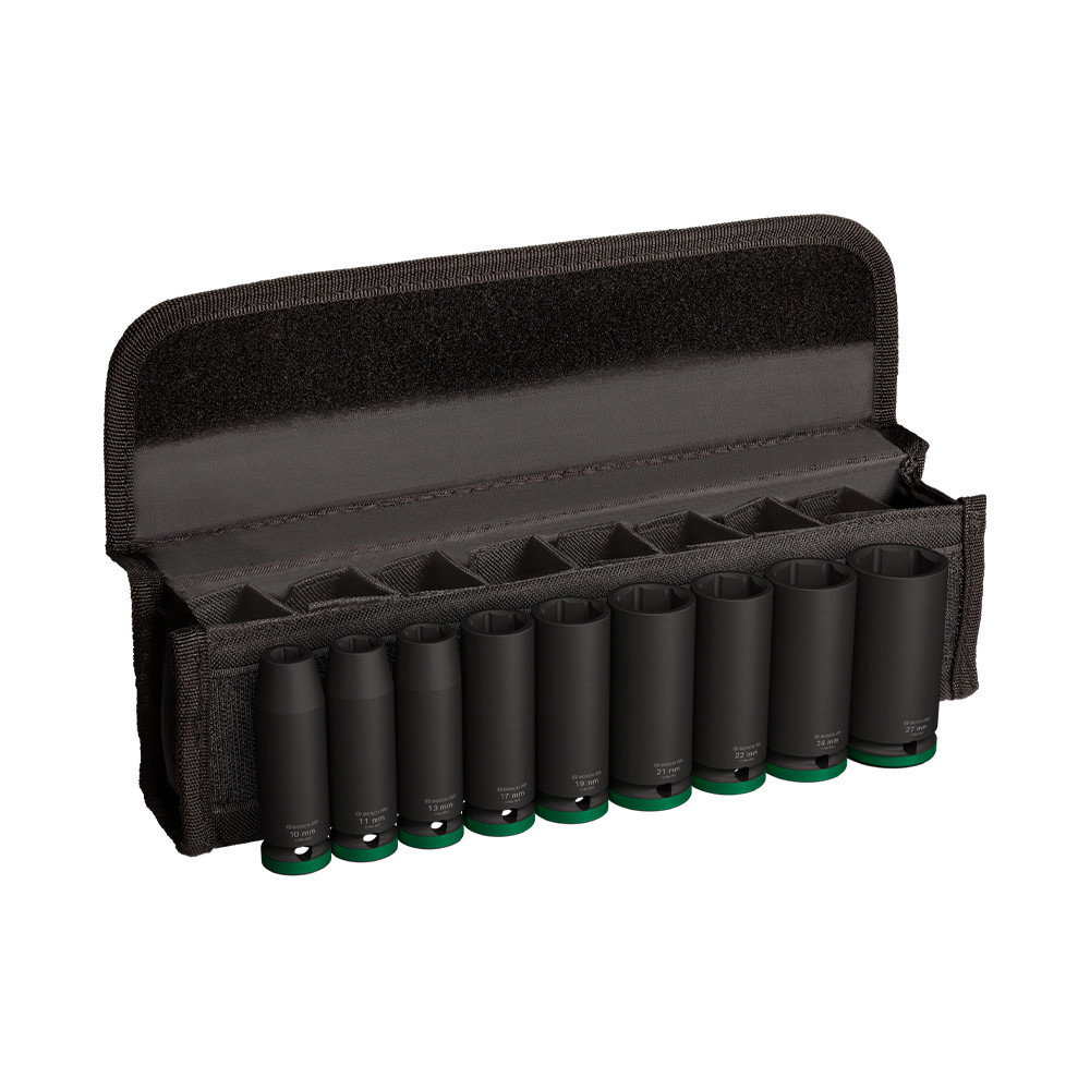 A PRO Impact Socket Setben lévő dugókulcsokat hőkezelt CRMO (króm-molibdén) acélból gyártottuk, és vastag fallal alakítottuk ki őket, hogy ellenálljanak a nagy nyomatékoknak