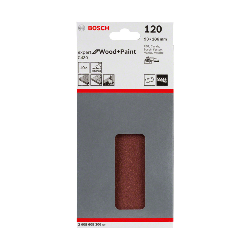 Bosch EXPERT C430 csiszolópapír rezgőcsiszolókhoz, fa és festék, 93x186 mm, G120, 8 lyuk, 10db