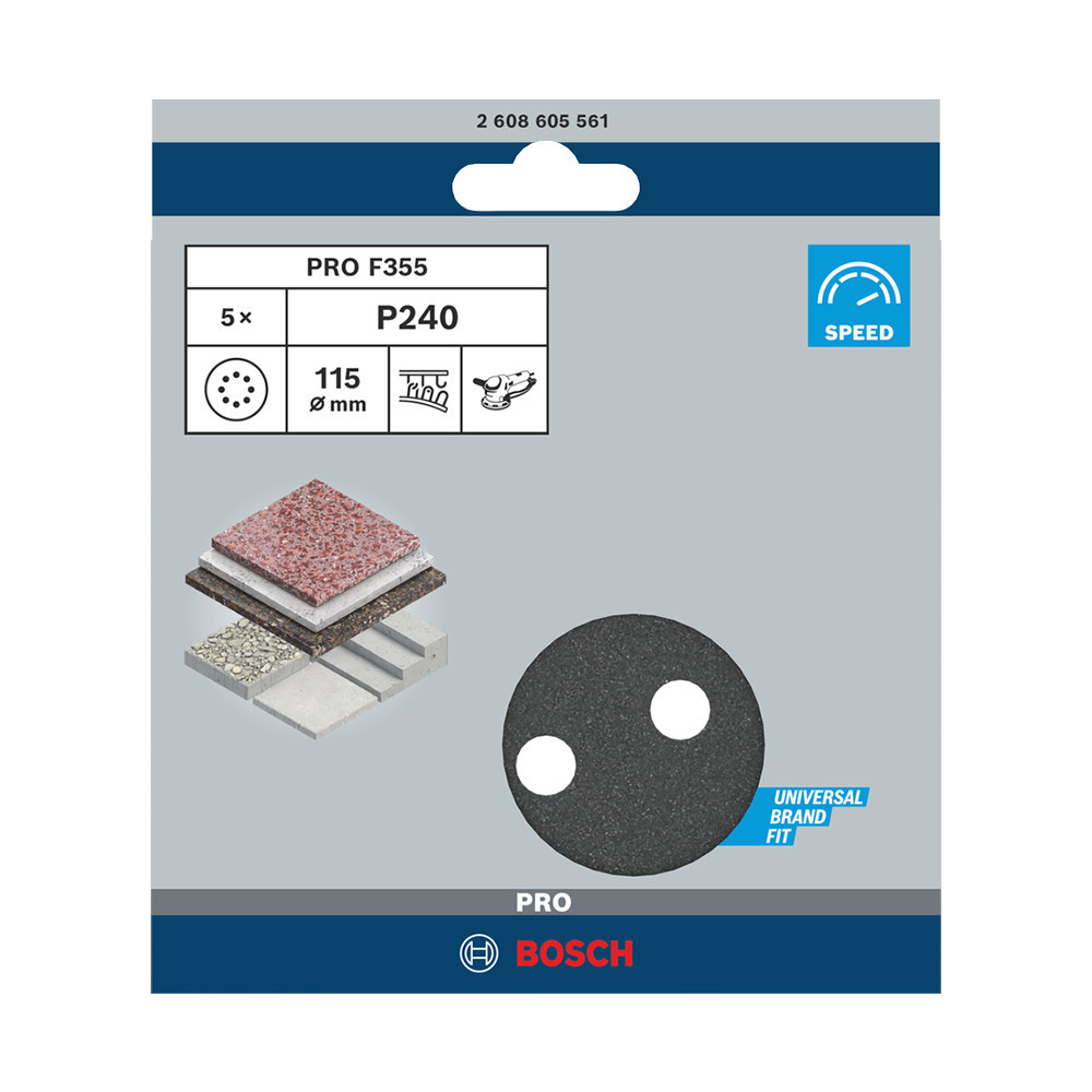 Bosch PRO F355 csiszolópapír, 115 mm, G240 tépőzáras, márvány, kemény kő, lakk, kompozit 5 db