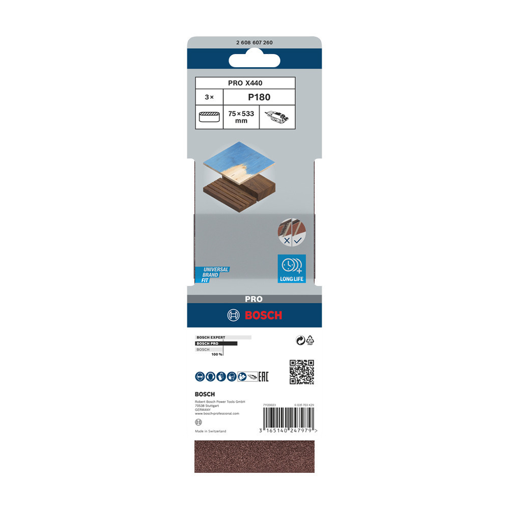 Bosch PRO X440 csiszolószalag, 75x533 mm, G180, fa, festék 3 db