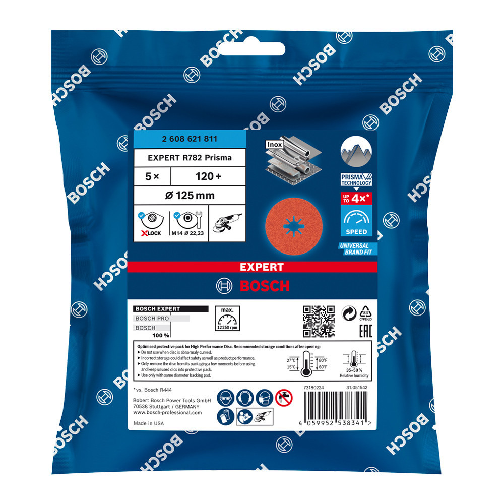 Bosch EXPERT R782 X-LOCK Prisma kerámiaszemcsés fíbertárcsa Inoxhoz, 5db 125mm, G120+