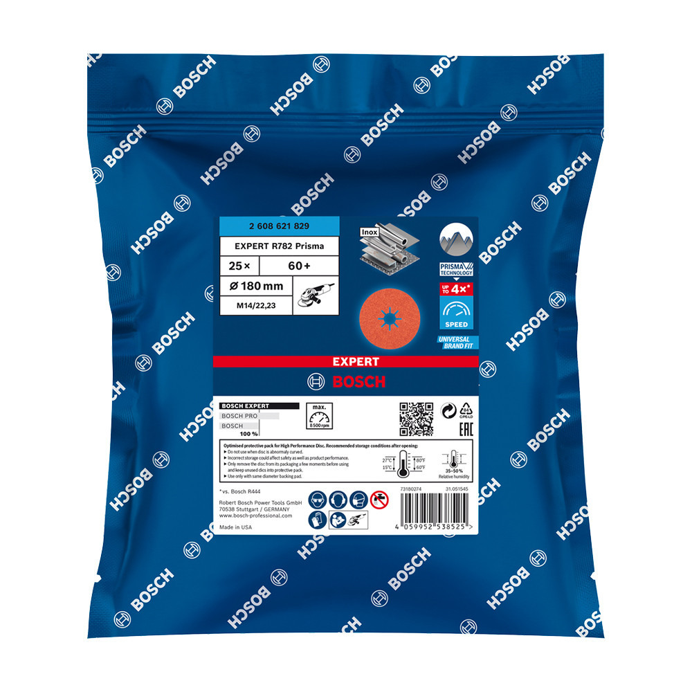 Bosch EXPERT R782 Prisma kerámiaszemcsés fíbertárcsa Inoxhoz, 25db Ø180mm, G60+