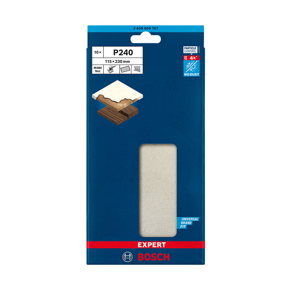 Fejlett porcsökkentés fa, festék és gipszkarton csiszolásakor - A Bosch Particle Control gondoskodik arról, hogy minden porszemcse a porszívóba vagy a szűrőbe kerüljön. A rendszer elsődleges eleme a Bosch EXPERT M480 csiszolóháló: A részecskék egyenesen áthaladnak a nyitott hálóstruktúráján, így nem tömítik el a felületet és nem szennyezik a levegőt. Ezáltal kiemelten hatékony és rendkívül tartós is. Csak ragaszd fel tépőzárral